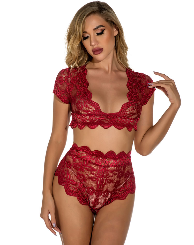 Entice your lover with subtle seduction in this enticing bra set featuring a lace bra top with sheer cups, a scalloped trim, and a matching high waisted panty with and a cheeky cut back.
