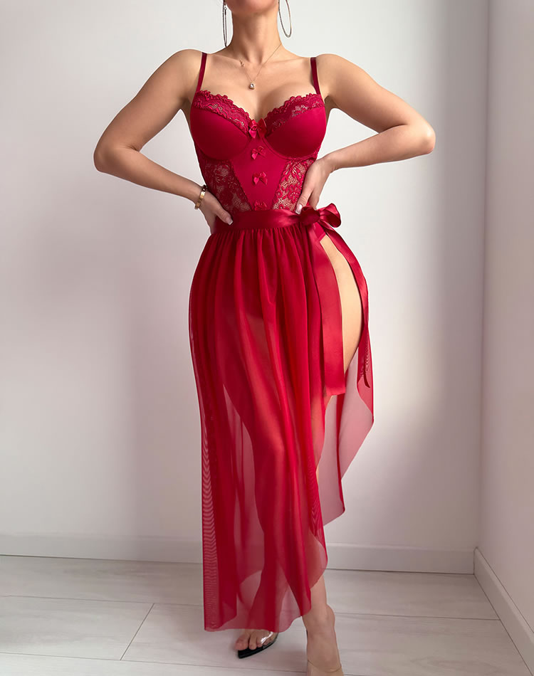 This elegant white lingerie set features a structured bustier top with delicate lace trim and a bow accent at the front, offering a romantic silhouette. Paired with a flowing sheer tulle overlay that drapes gracefully from the waist, it creates a soft, ethereal look. The high-cut design enhances movement and confidence, making it ideal for special moments or intimate evenings.