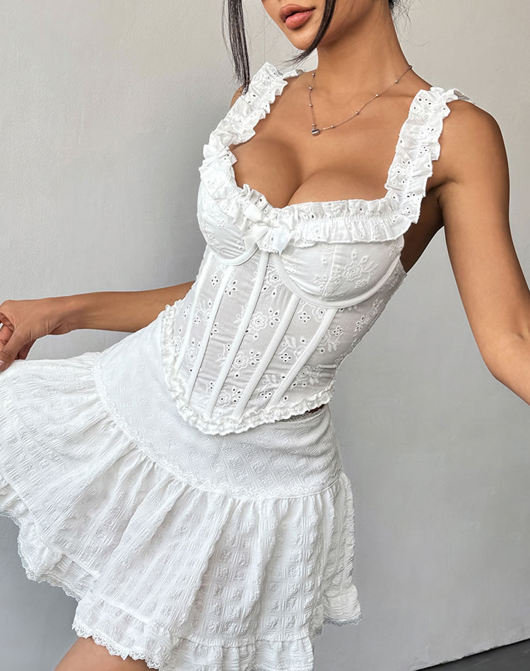 This stunning white corset features intricate ruffle detailing that adds a touch of romance and charm. The thick shoulder straps design accentuates the shoulders beautifully. Perfect for special occasions or as a statement piece in your wardrobe, this corset combines elegance with a playful twist.
