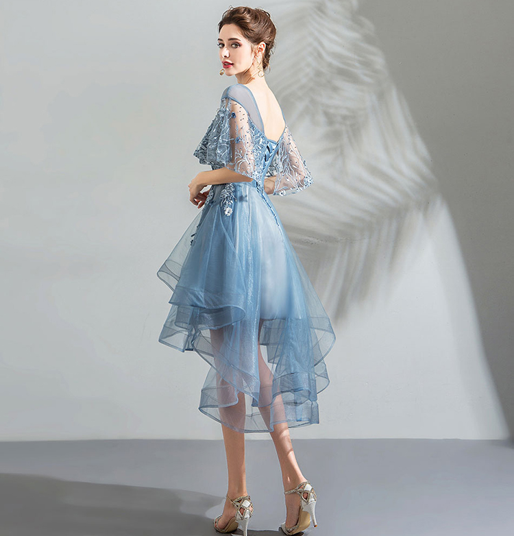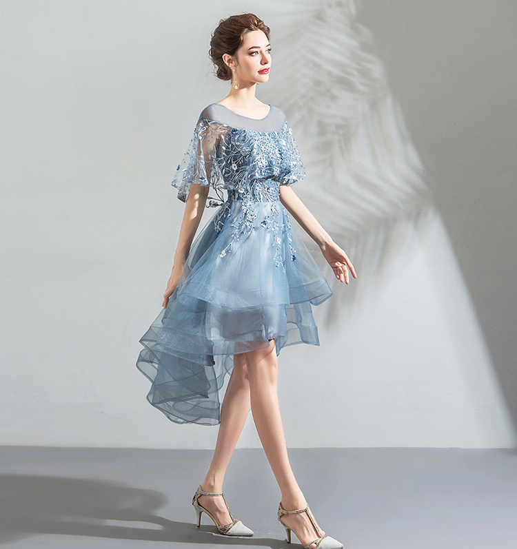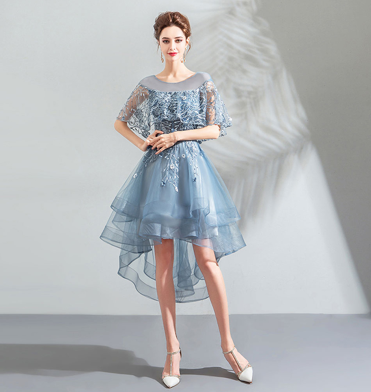 This dress features a lace illusion bodice and shawl wrap; Elegant embroidery flowers; A-line silhouette; Front Short Back Long.