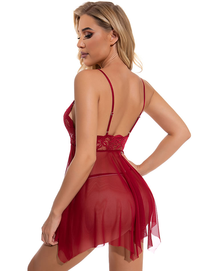 Lead with your heart in this ultra sassy babydoll set featuring sheer lace triangle cups with strappy bust detailing, adjustable shoulder straps, a sheer mesh skirt with an open front, and a matching mesh panty.