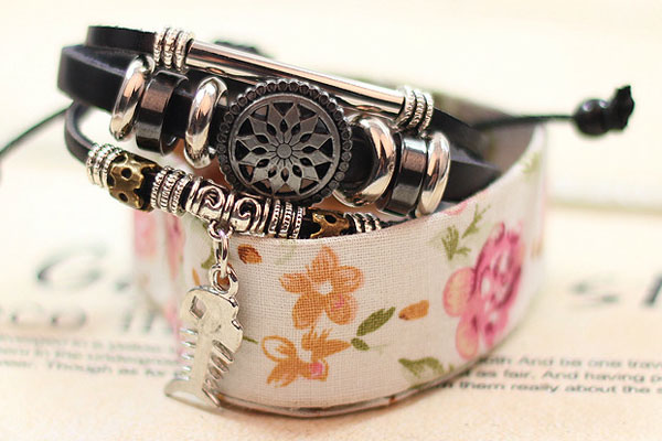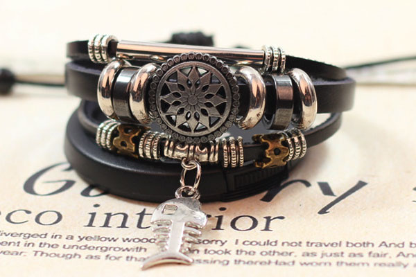 Fishbone Alloy Pendant Beads Rope Black Leather Unisex Wrap Bracelet