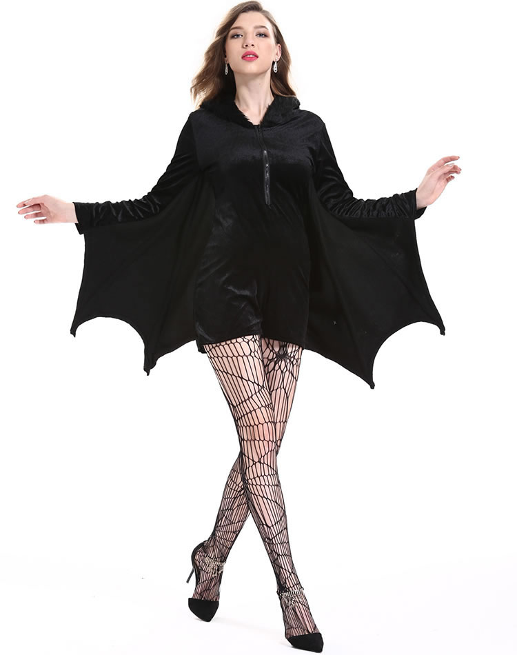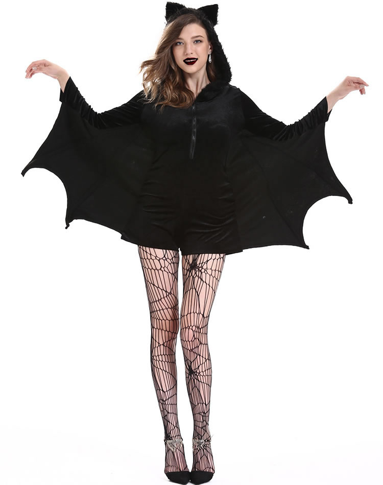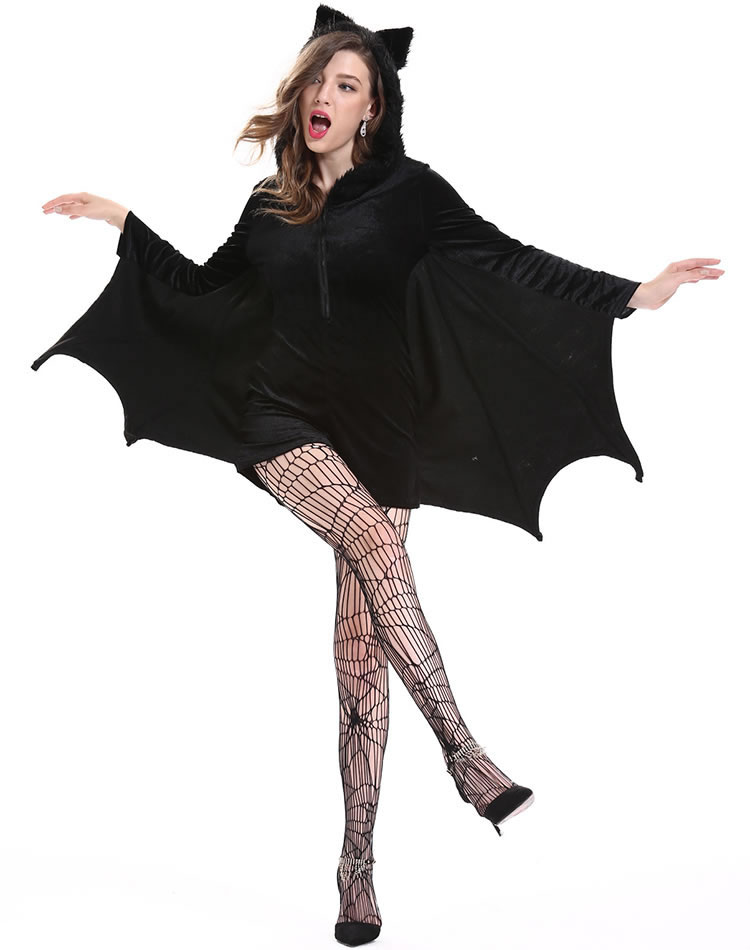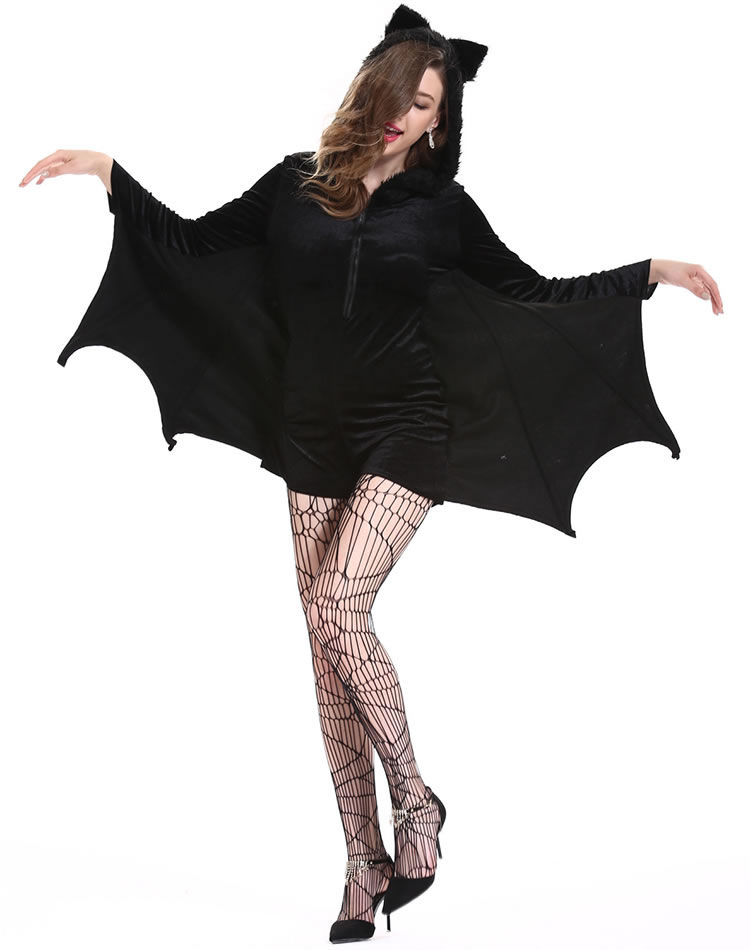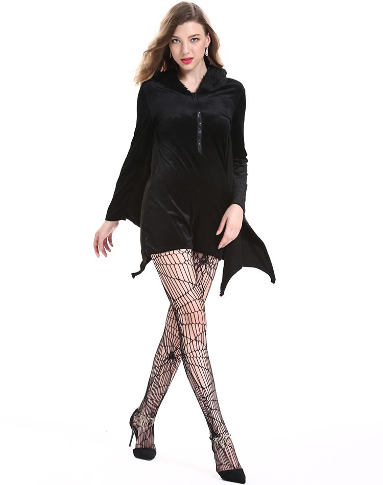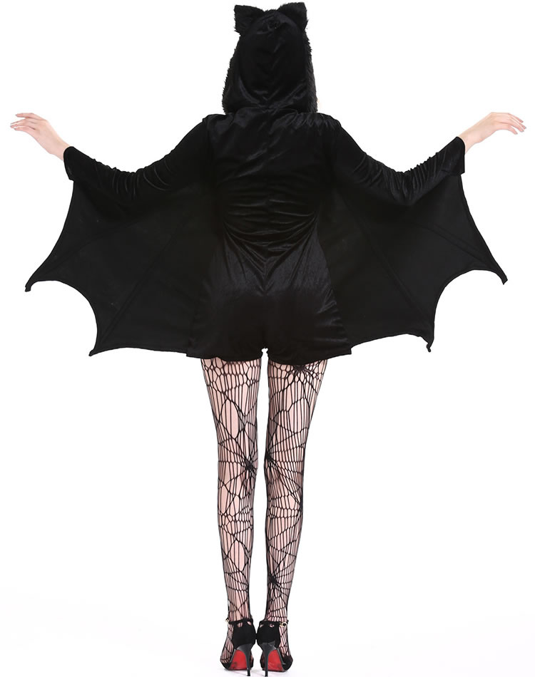 Soar through the night in comfort in this Fleece Bat costume featuring a black fleece dress with zip up front, attached bat wing sleeves, jagged hemline and attached hood with faux fur trim and ears. (Stockings not included.)