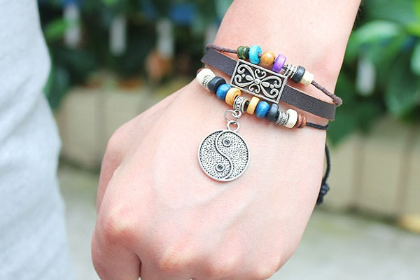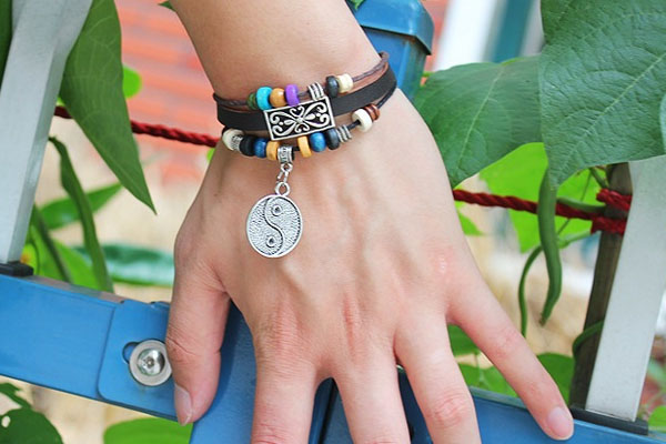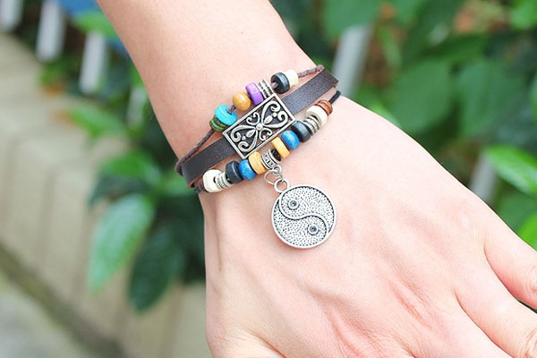 Floral Flower Taiji Ying Yang Circle Metal Leather Brown Weave Bracele