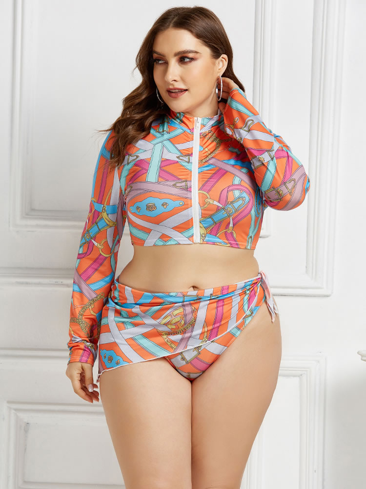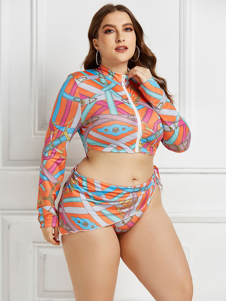 Front Zipper Print Three Pieces Tankinis