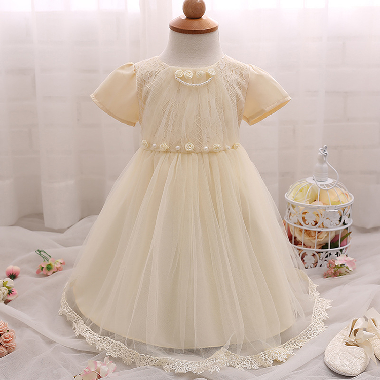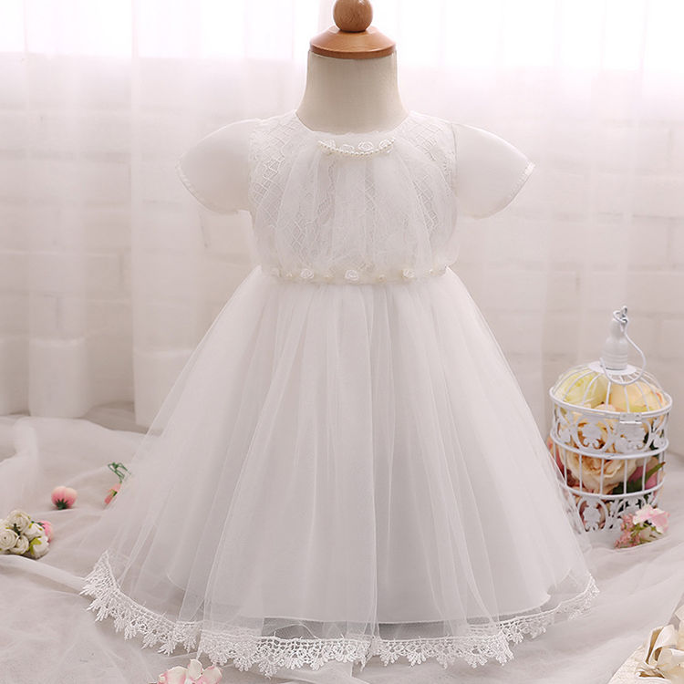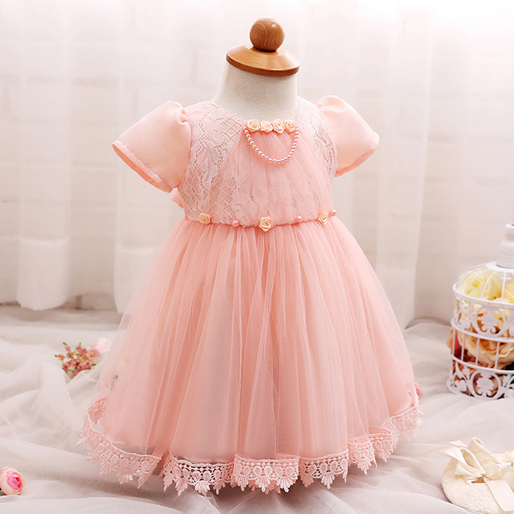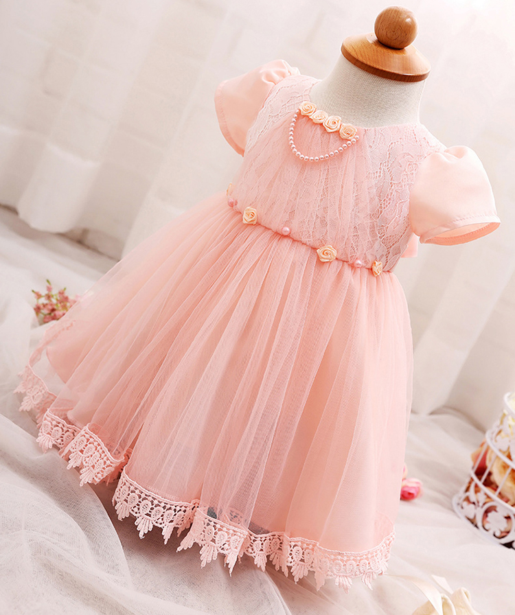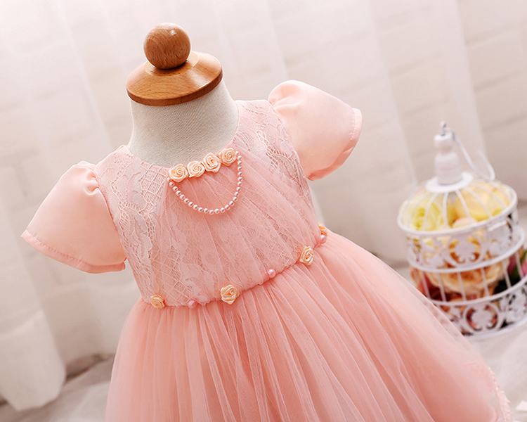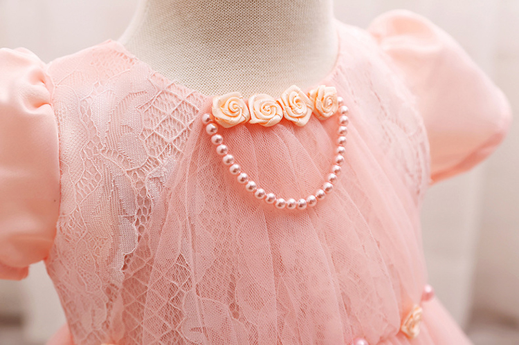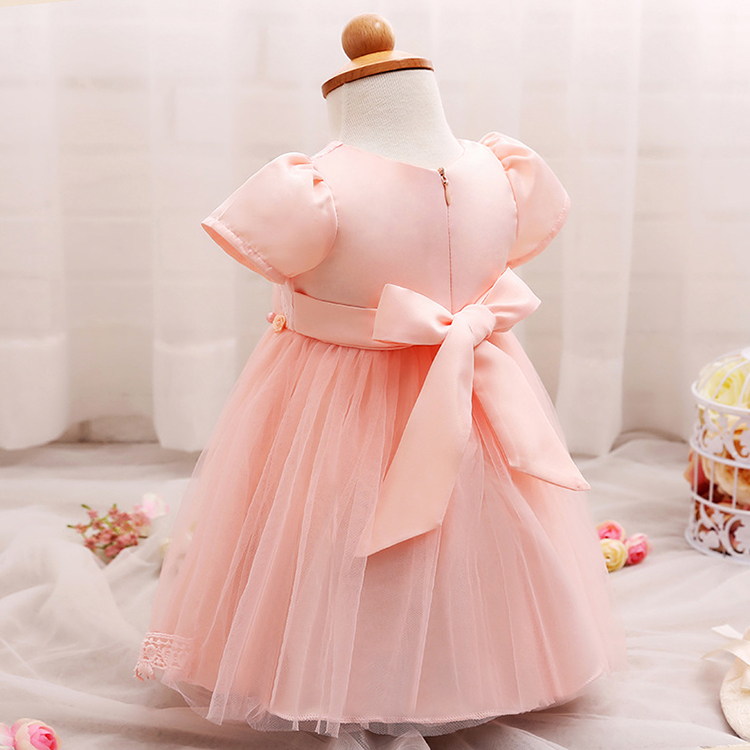 Hidden zipper and a big bow on the back. The pink pearls mosaic on the round-neck show the cute and elegant.