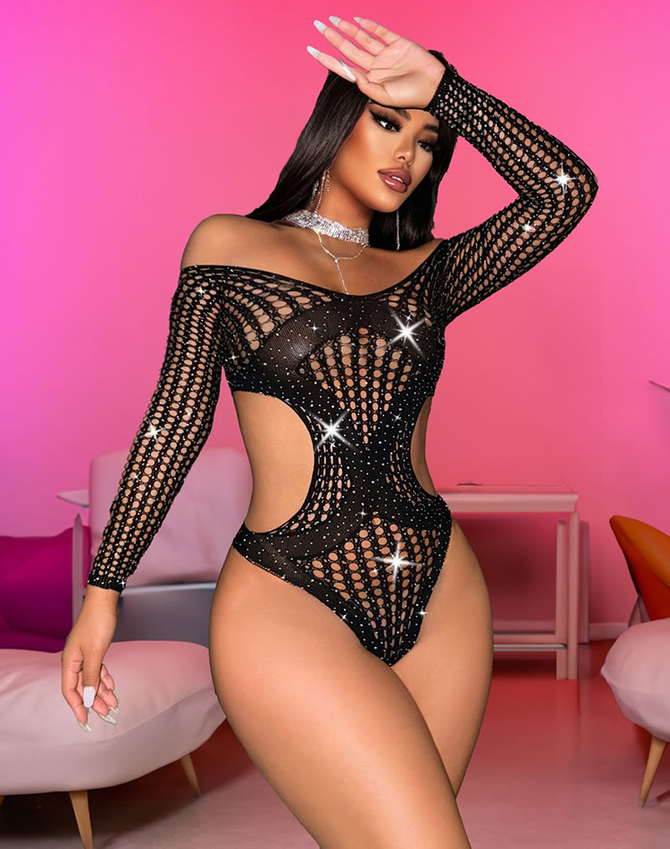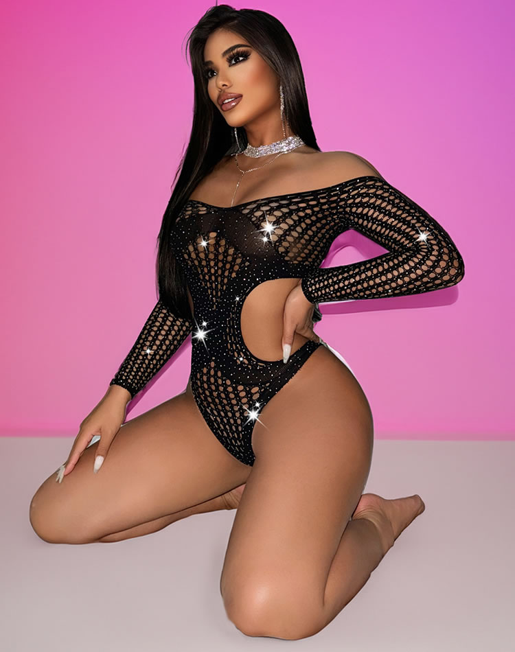 This glamorous lingerie set is designed to make a bold and captivating statement. The bodysuit features an off-the-shoulder design with long sleeves, creating a striking and elegant silhouette. The intricate fishnet pattern is adorned with sparkling embellishments that catch the light, adding a touch of glamour and sophistication. Strategic cut-outs on the sides enhance the visual appeal, making it perfect for special occasions or intimate moments.