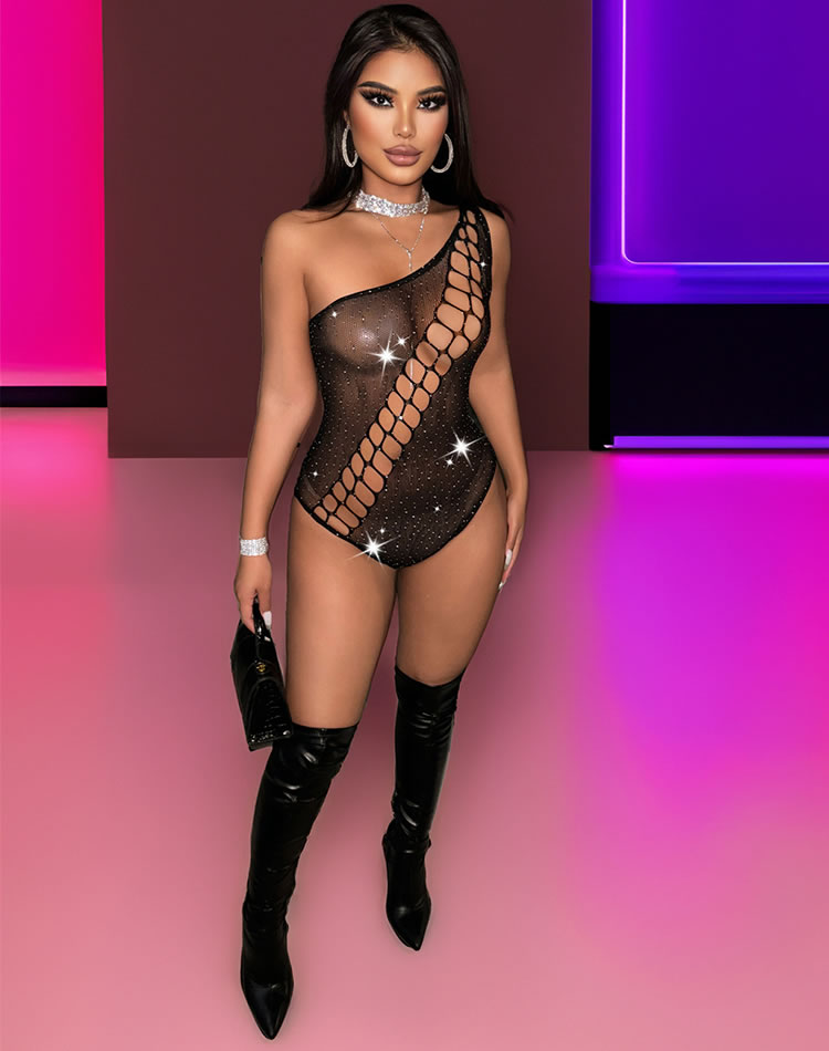 This glamorous lingerie set is designed to make a bold and captivating statement. The bodysuit features a one-shoulder design with intricate fishnet patterns that accentuate your curves. The asymmetrical neckline adds a touch of elegance, while the sparkling embellishments catch the light, creating a stunning visual effect. Strategic cut-outs on the side enhance the visual appeal, making it perfect for special occasions or intimate moments.