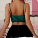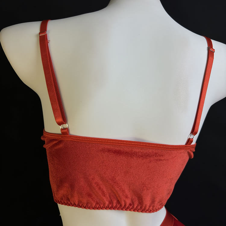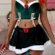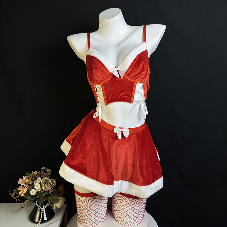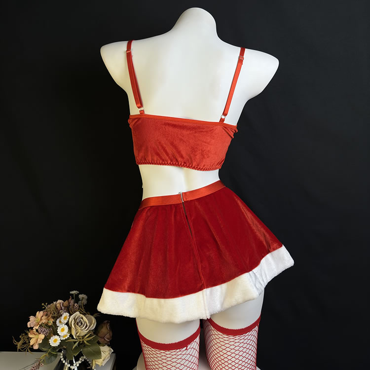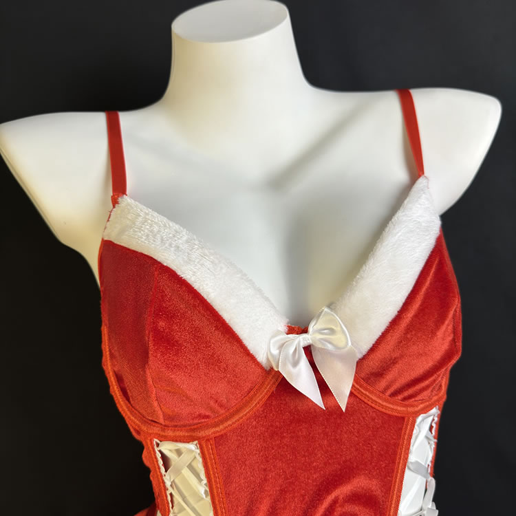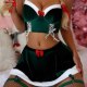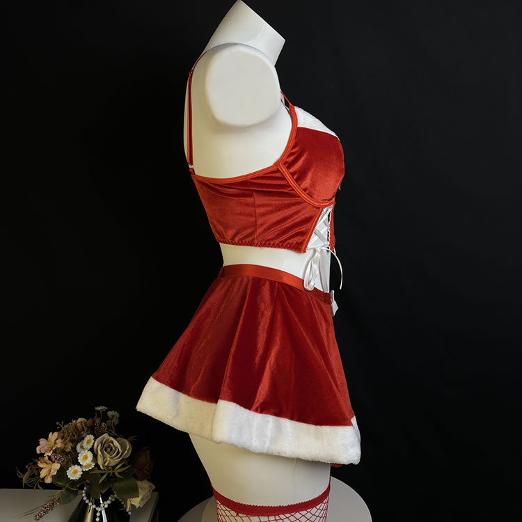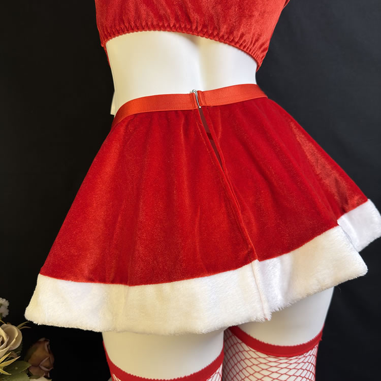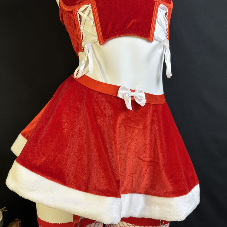 Get into the holiday spirit with this eye-catching two-piece set featuring a green velvet top with white fur trim and adjustable lace-up sides. The cropped design shows off your midriff, while the flirty mini skirt has a soft white faux fur hem and a red bow at the front. Paired with matching garter straps, it’s perfect for Christmas parties, themed events, or festive date nights. Easy to wear and designed to stand out during the season. (Fishnet stockings not included.)