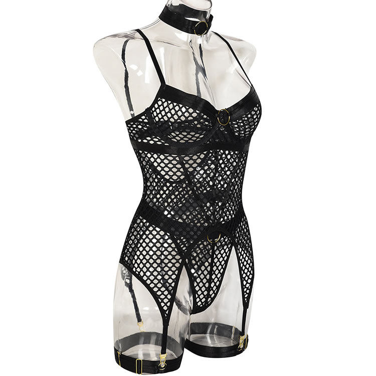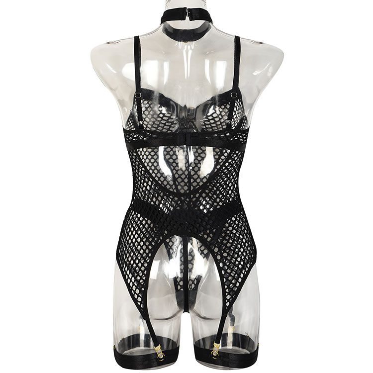 Spice up your evenings in this sultry bustier featuring sheer underwire cups with an O-ring details, an allover sheer honeycomb design, adjustable spaghetti straps, a hook and eye back closure, a sheer bodice, an open back panel, adjustable garter straps, adjustable leg garters, and a matching thong.