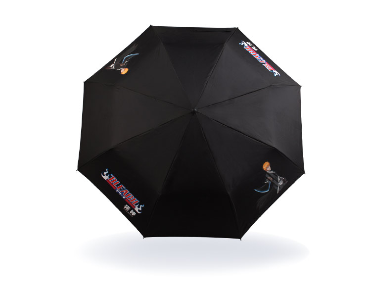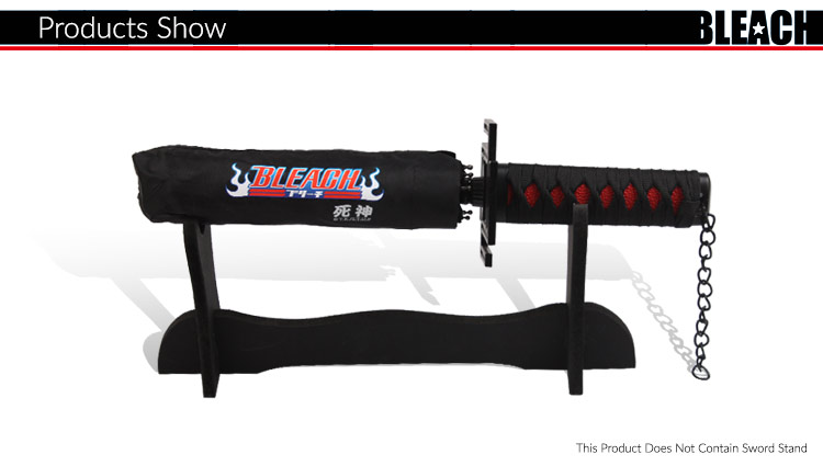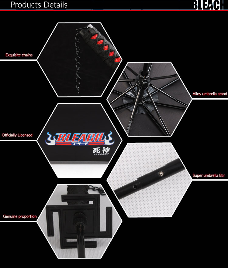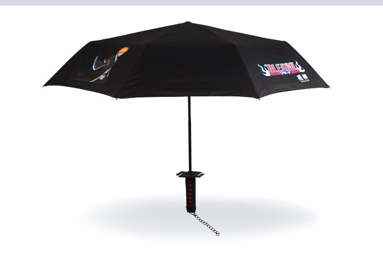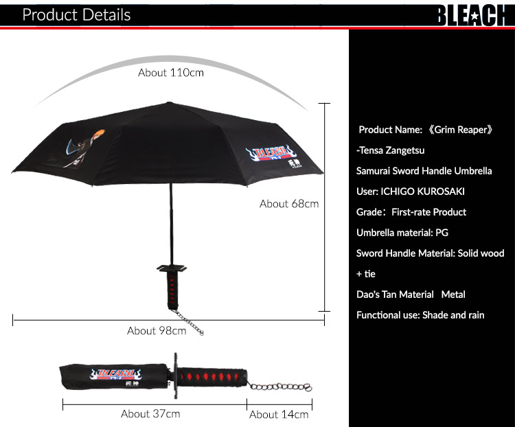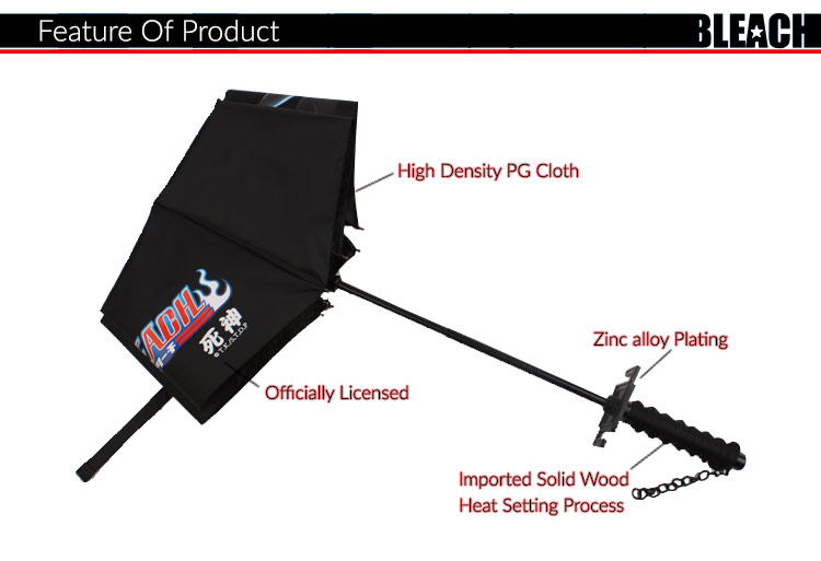 The Japanese anime umbrella comes complete with a black imitation ray skin with ICHIGO KUROSAKI print and a wooden handle with chain. The shaft of this awesome umbrella is made from alloy with the traditional umbrella spokes.