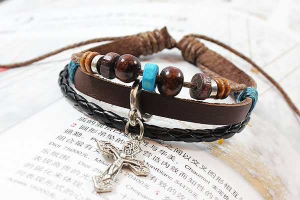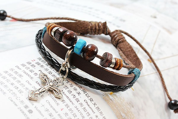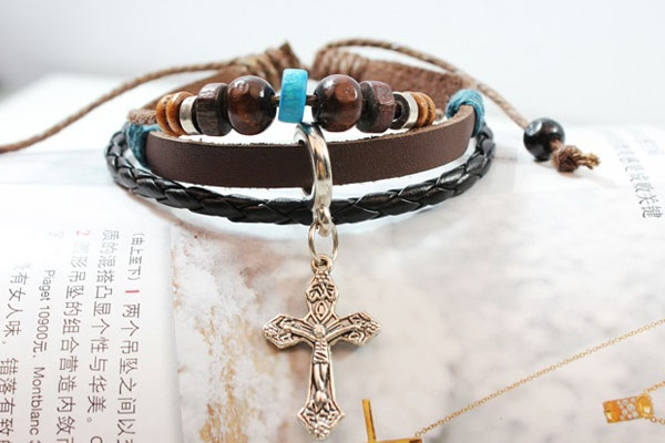 Inspirational Cross Pendant Beads Braided Rope PU Leather Bracelet
