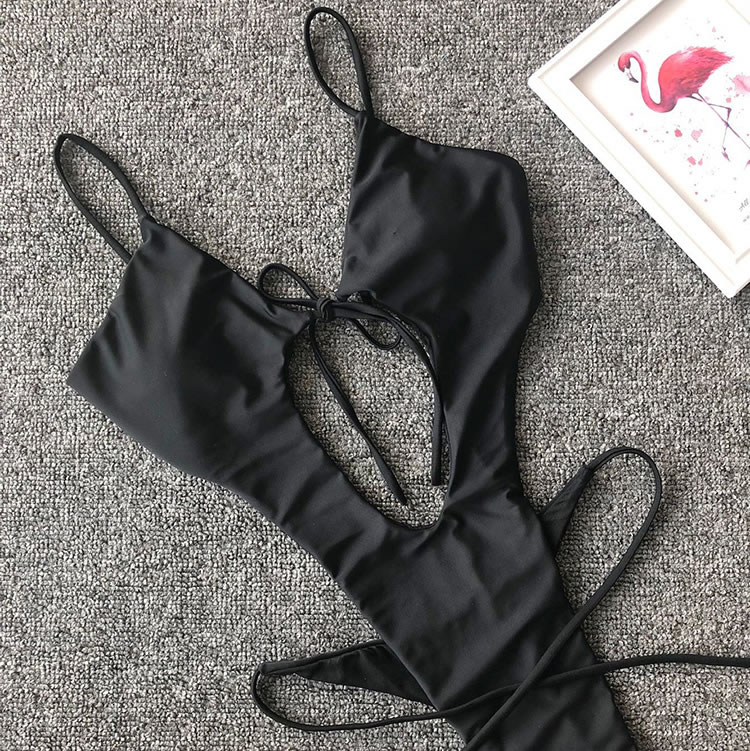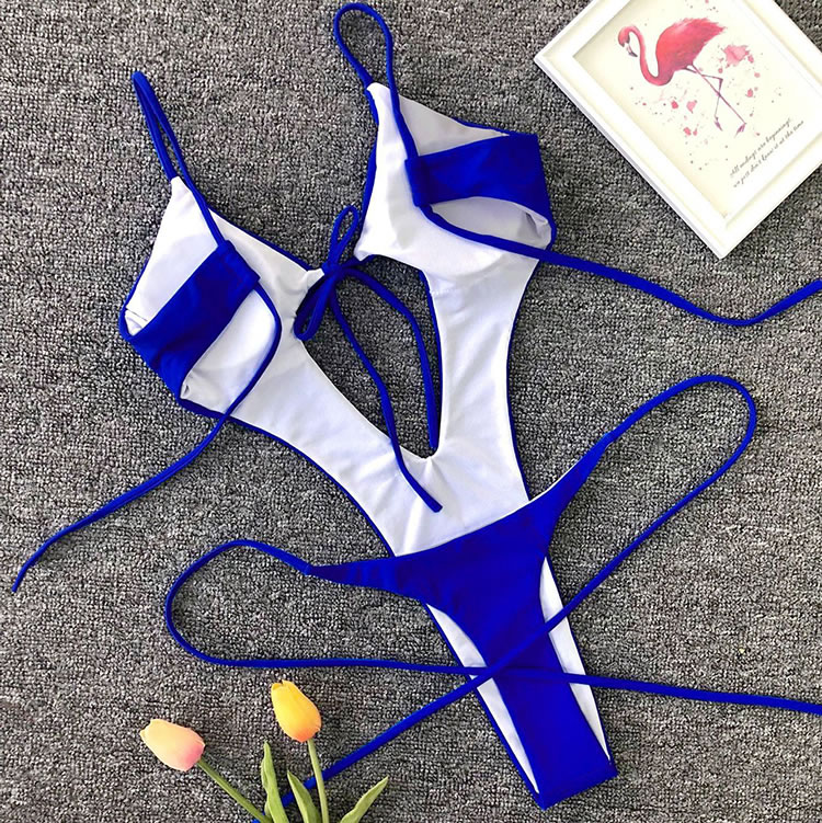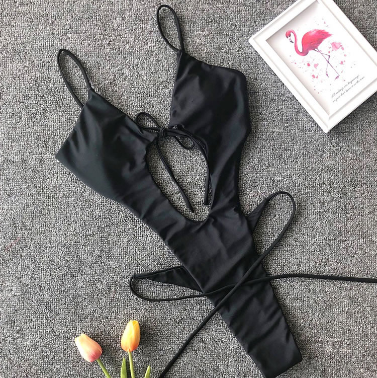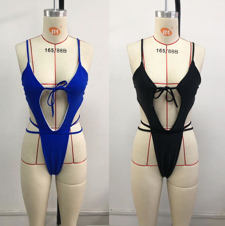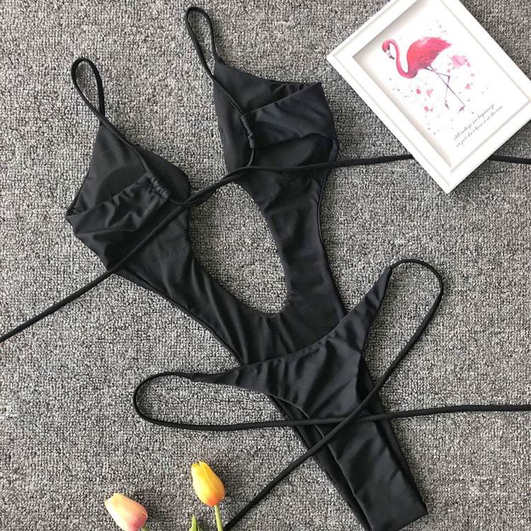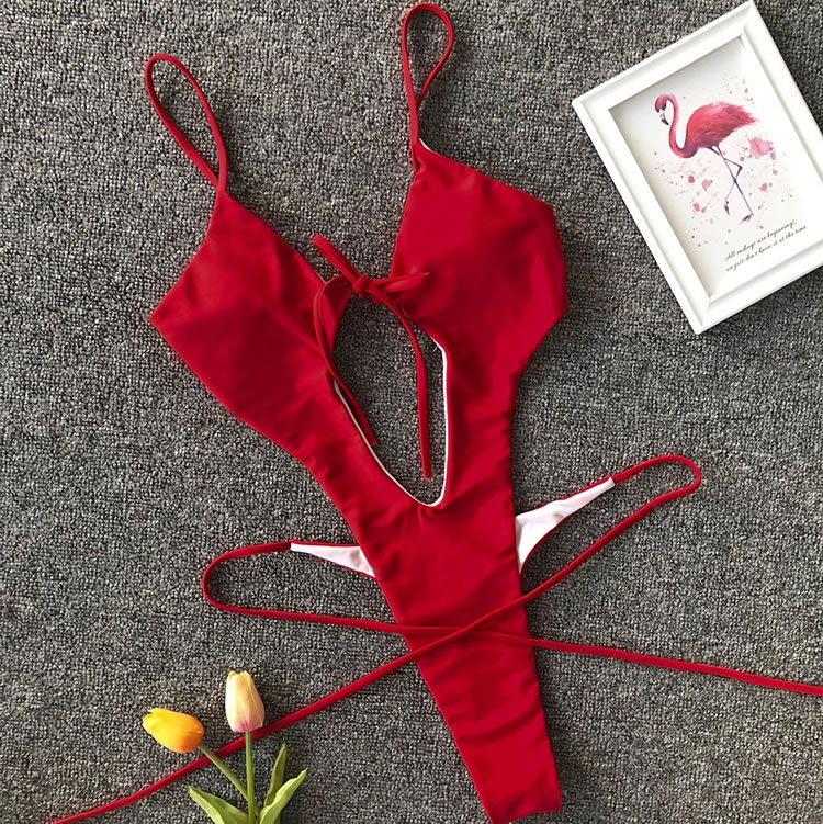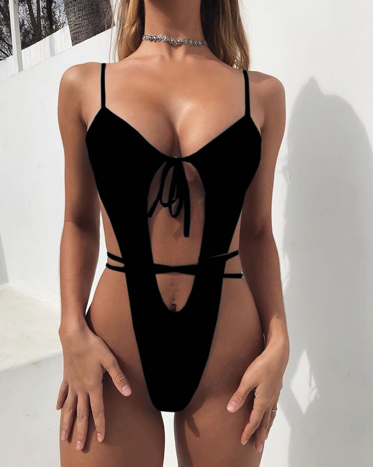 Relax by the pool in this alluring swimsuit featuring a scoop neckline with a front tie closure, spaghetti straps, an open bodice panel, a criss-cross waist belt, ultra high cut sides, and a thong cut back.