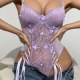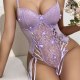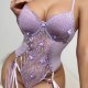 This elegant lavender lingerie bodysuit combines sheer mesh fabric with intricate lace patterns and decorative flower accents for a soft yet daring look. The underwire bra offers support with a scalloped edge and delicate floral embellishments across the cups. Side panels feature crisscross lacing that adds visual interest and adjustable fit, while the back includes a keyhole cutout for a modern touch. Designed to highlight curves, it’s perfect for intimate evenings or special occasions.