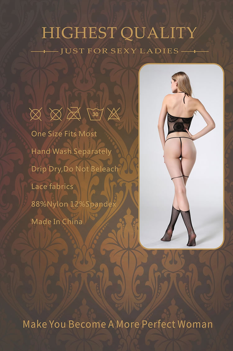 Give your babe something to dream about in this stunning bodystocking featuring halter ties, oversized satin bow accents, attached garters, an open crotch, and an over the toe style. (Panty not included.)