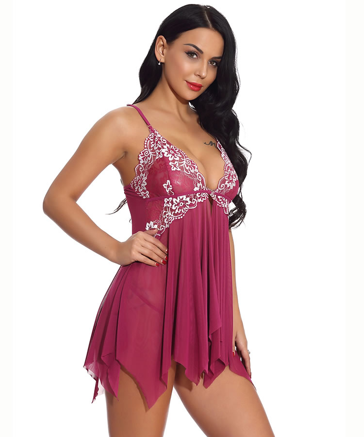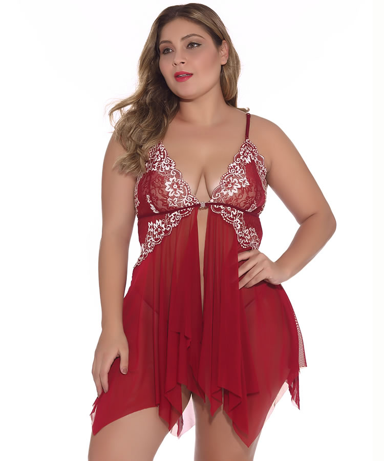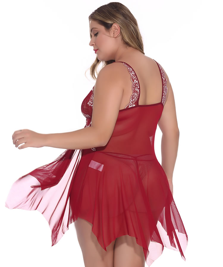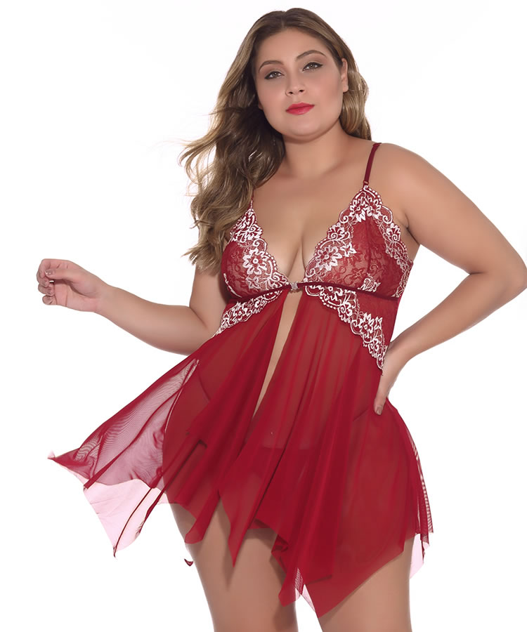 Dare to divulge all your dirty secrets in this sexy babydoll set featuring sheer lace cups with a scalloped trim, adjustable spaghetti straps with lace detailing, a hook front closure, a loose mesh bodice with a vented open front, an asymmetrical hem, and a matching thong panty.