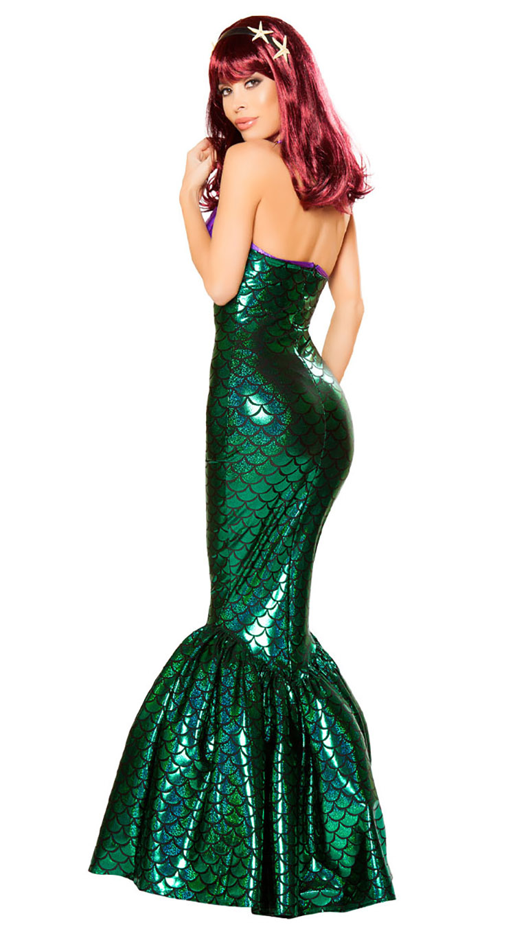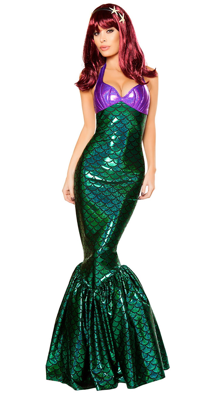 Swim beneath the waves in this Mermaid Temptress costume featuring a tight dress with purple cups, halter straps, a green skirt with a scale design, a flared fin trim, and a back zipper closure. (Headband not included.)