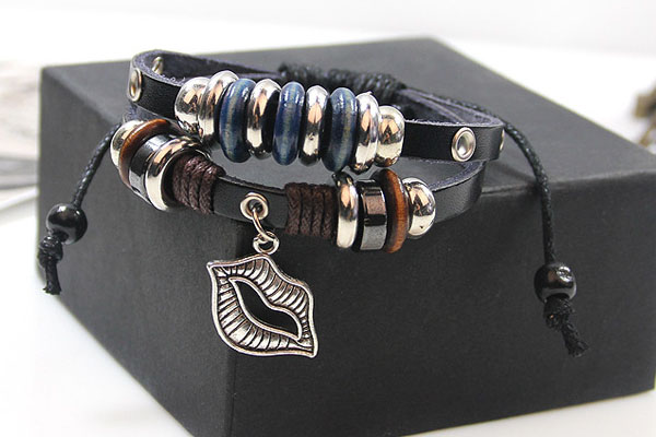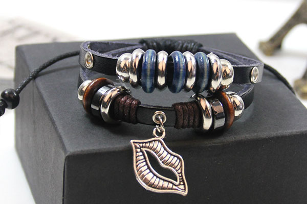 Metal Rings Dual Layer PU Leather Belts Bracelet With Lip Pendant