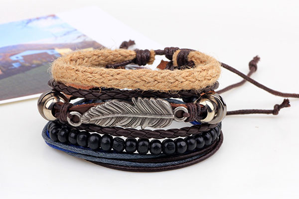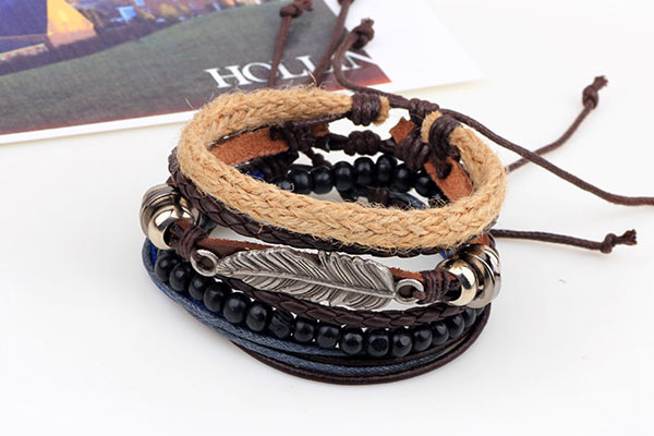 Multilayer Beads Rope Leaf Braided Adjustable PU Leather Bracelet
