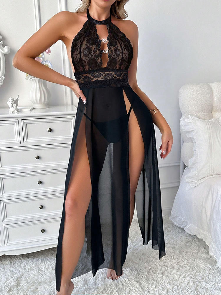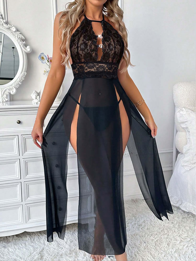 Elevate your nightwear game with this sultry black lace maxi robe. The intricate lace detailing at the top adds a touch of elegance, while the sheer fabric and high slit create an alluring silhouette. Perfect for adding a hint of mystery to your intimate moments or as a stunning cover-up for lounging in style.