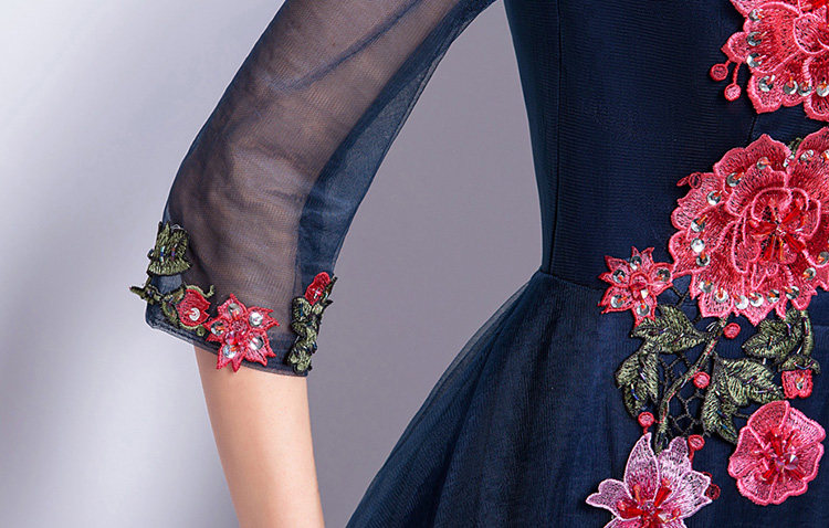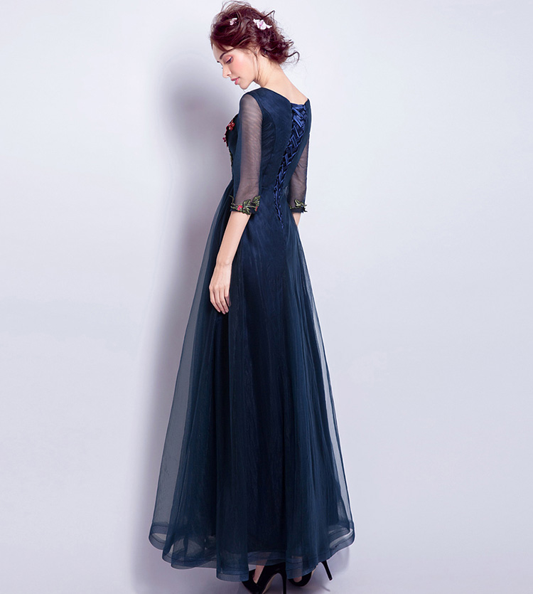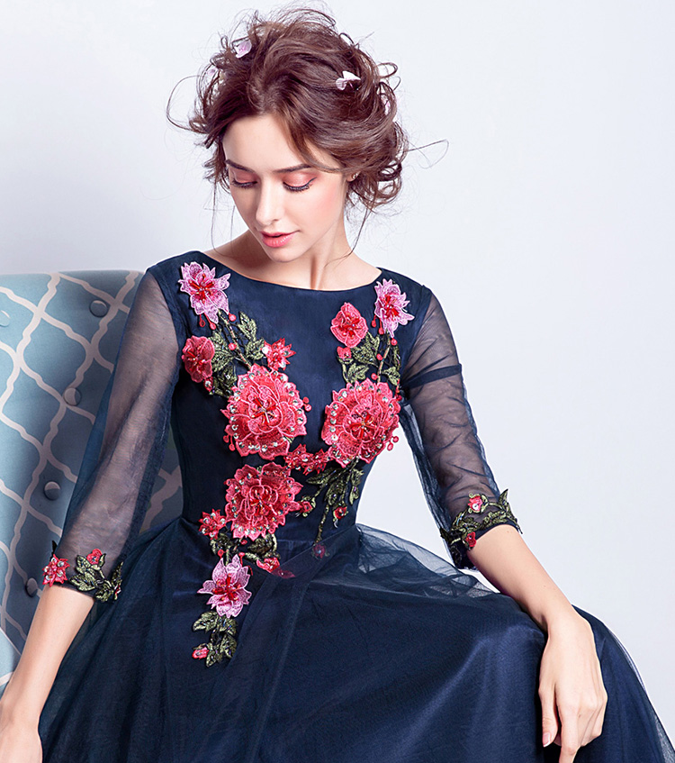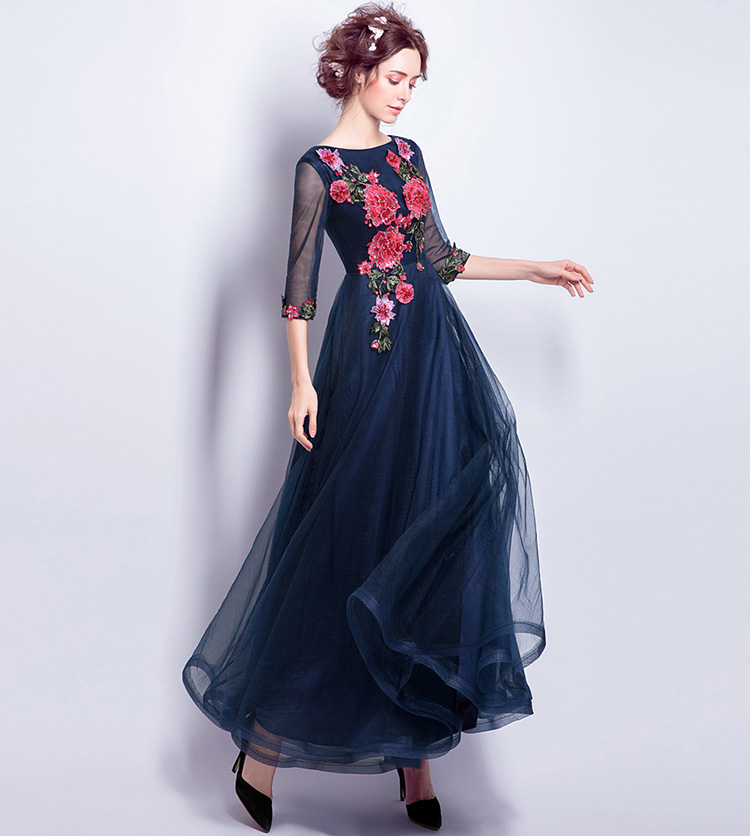 New Dark Blue Flower Embroidery Women Evening Dresses