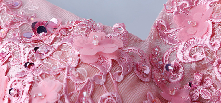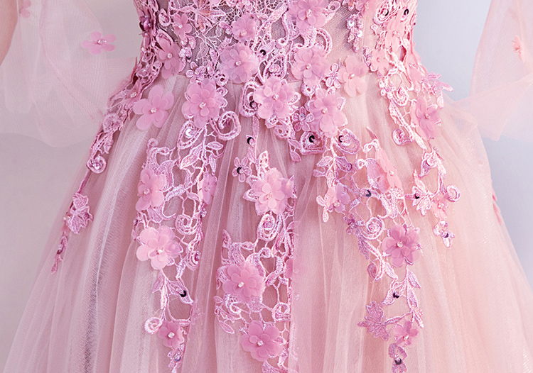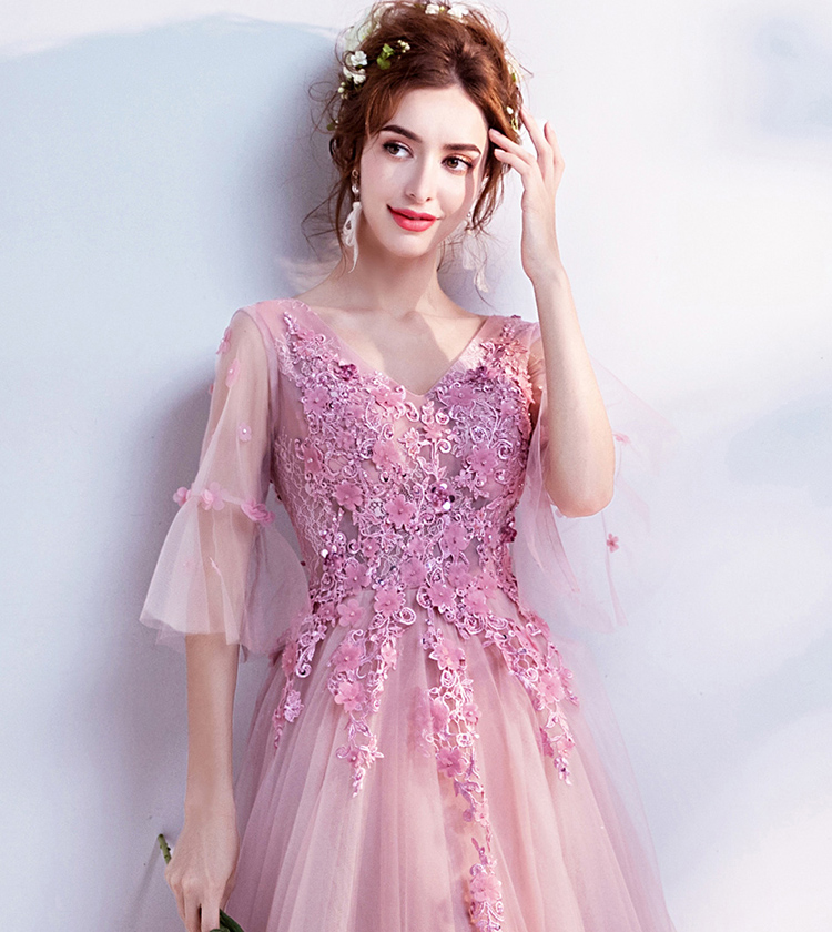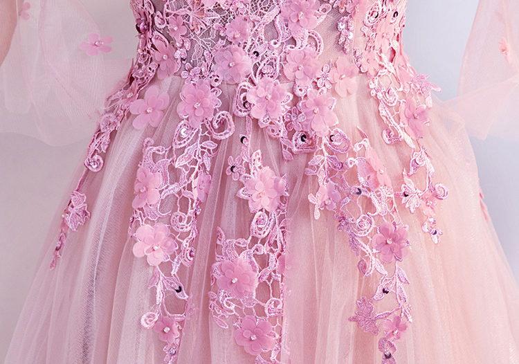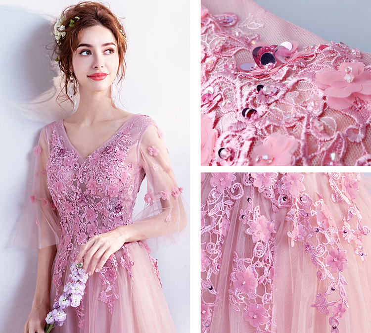 Pink Flare Sleeve Lace Embroidered Evening Dress