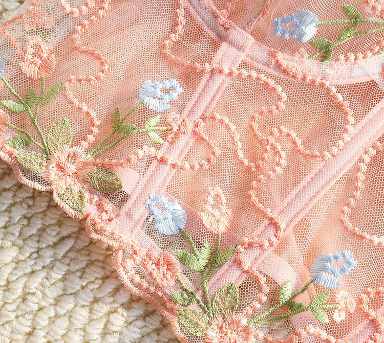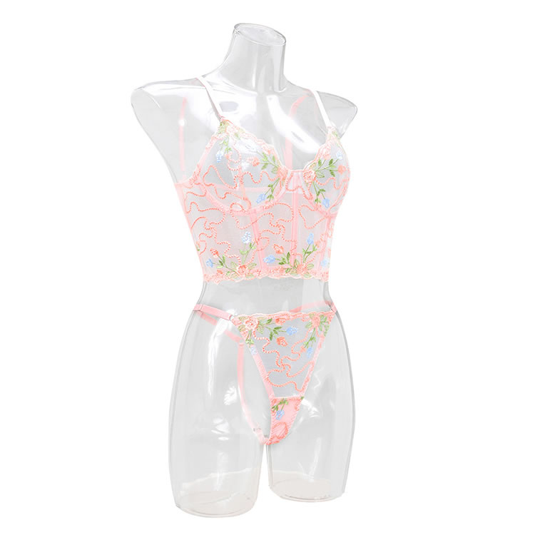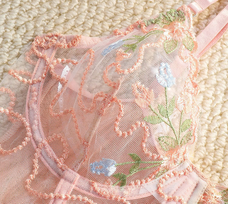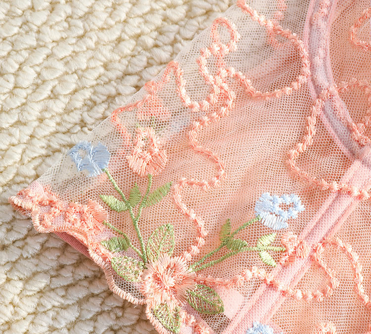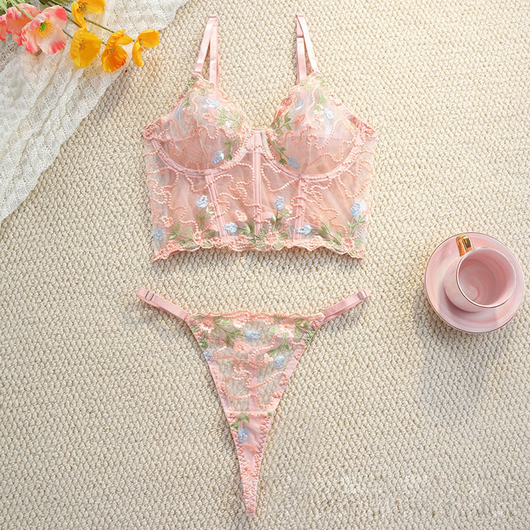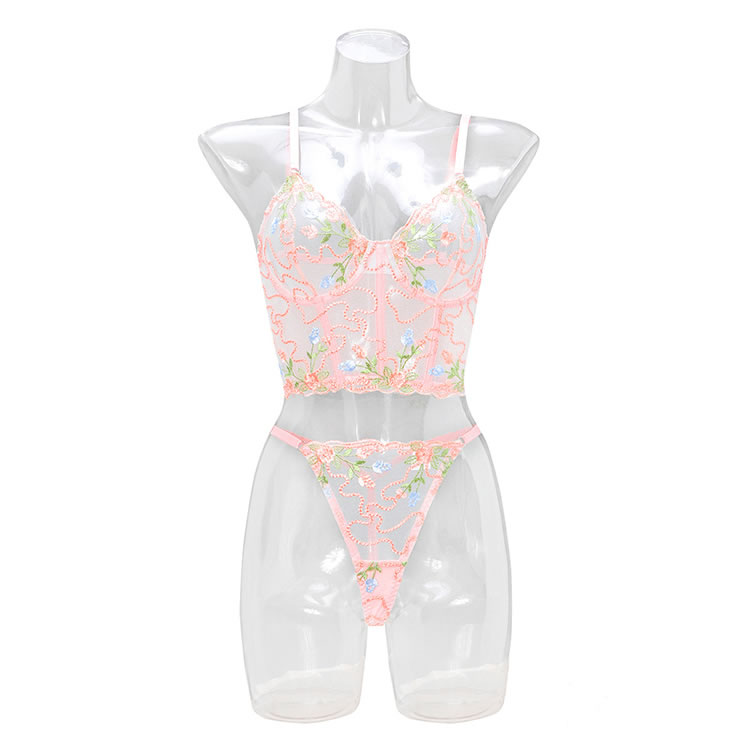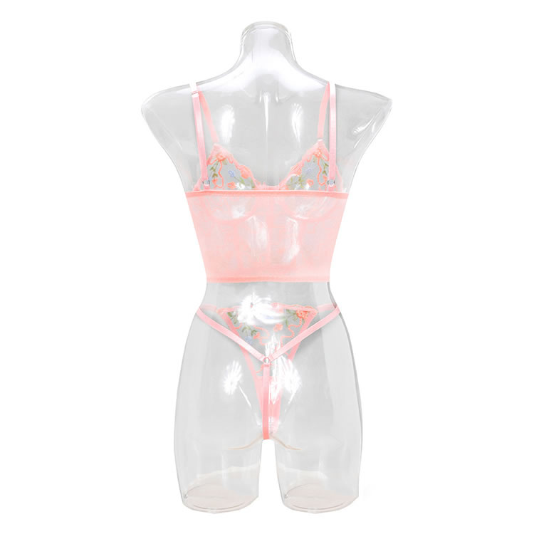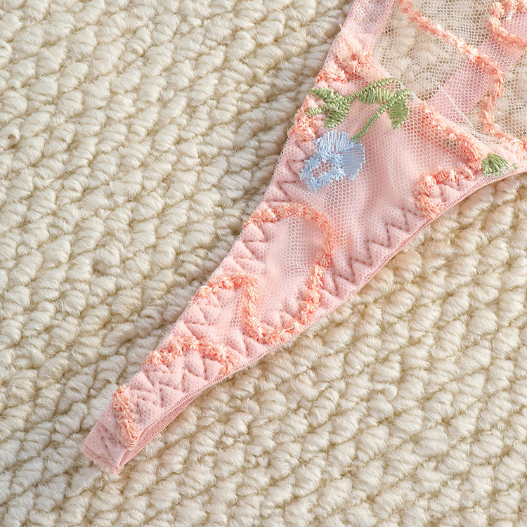 This delicate lingerie set features a soft pink base with intricate floral embroidery in pastel tones, creating a romantic and feminine look. The bra has structured cups with sheer mesh panels and lace trim, while the matching thong offers a minimalist design with thin straps and a low-rise fit. The back of the bra is fully open, adding a touch of boldness to the otherwise sweet aesthetic.