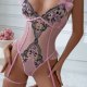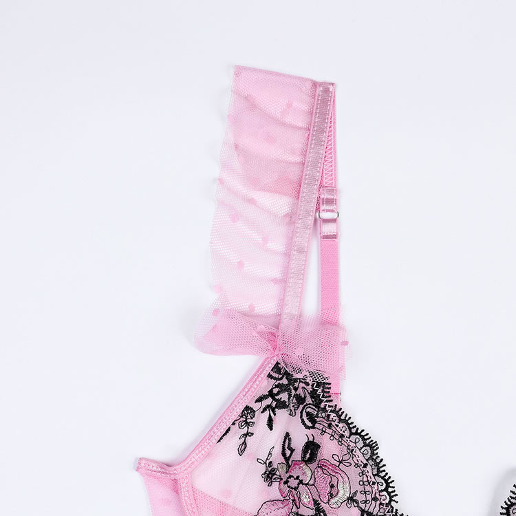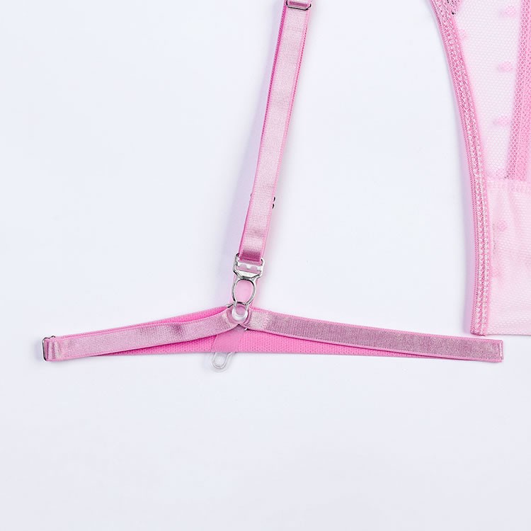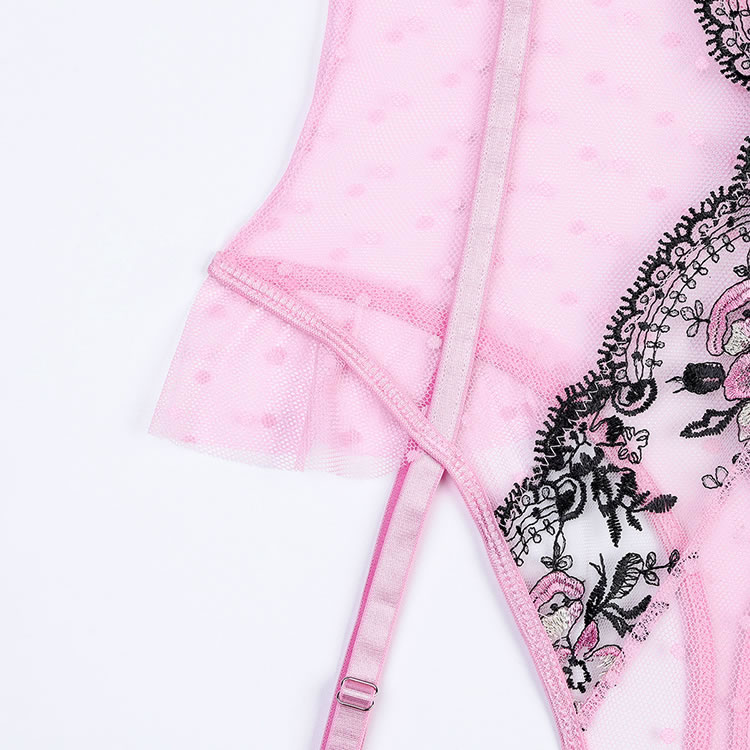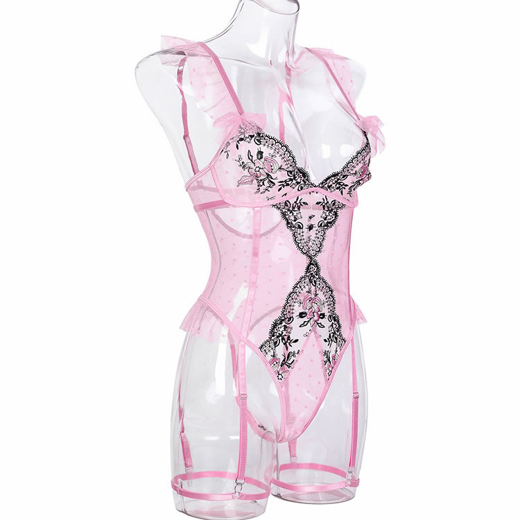 This charming lingerie set features a soft pink mesh bodysuit with delicate black lace detailing and floral embroidery, creating a sweet yet bold look. The design includes sheer panels, polka dot accents, and ruffled shoulder straps adorned with tiny bows for added femininity. Adjustable garter straps securely hold stockings in place, while the front cutout and back keyhole add a touch of allure. Perfect for those who love romantic and playful styles.