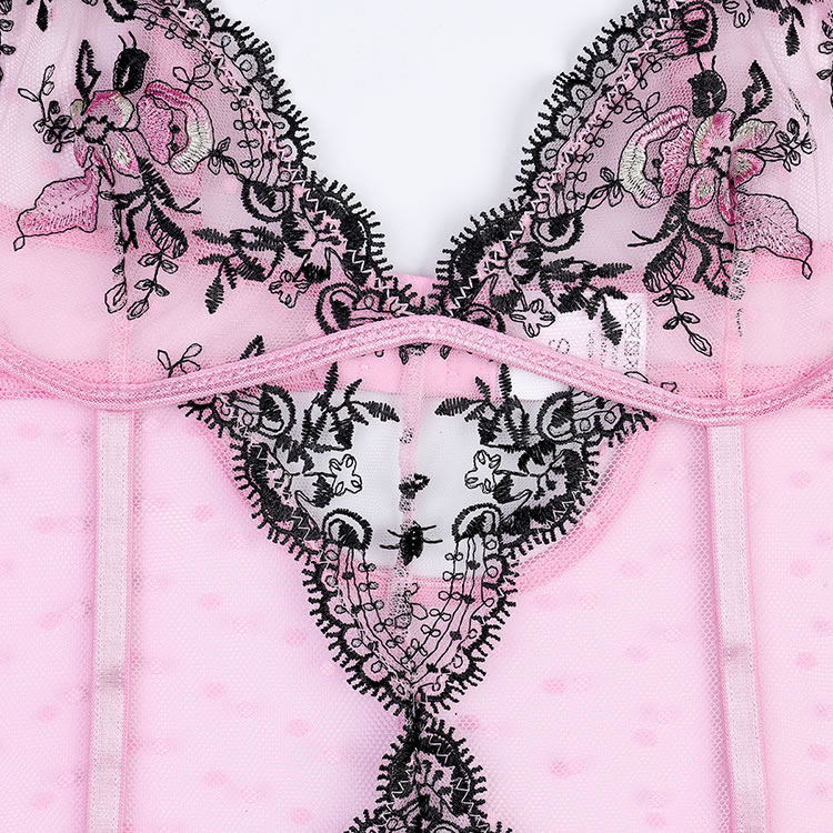 Pink Mesh Bodysuit with Black Lace Embroidery
