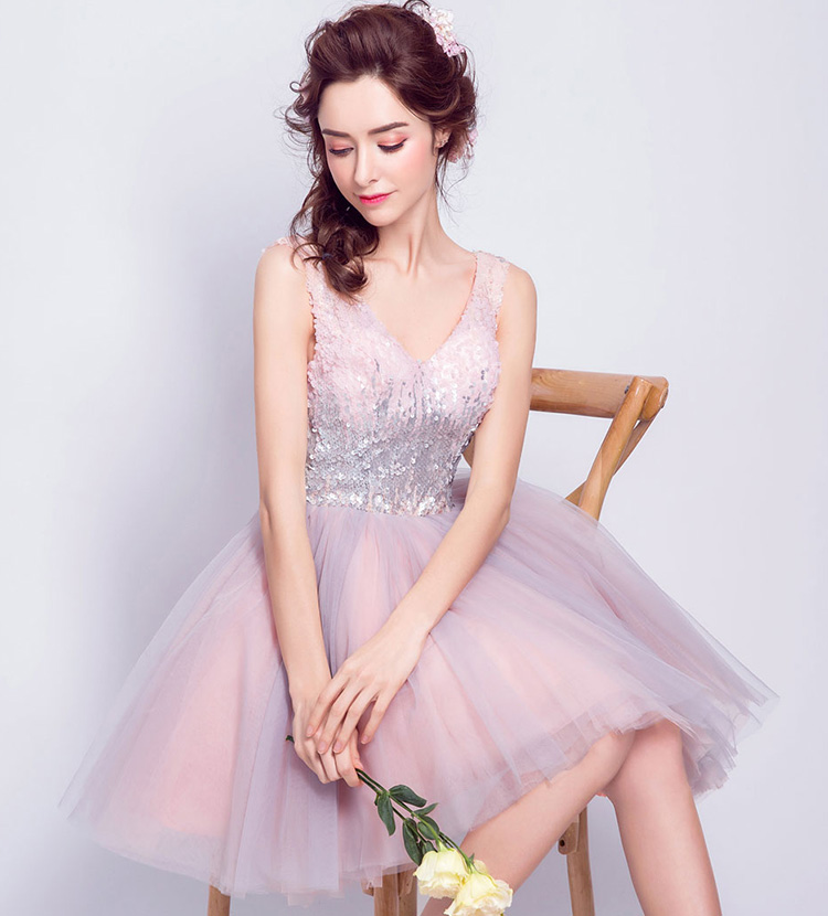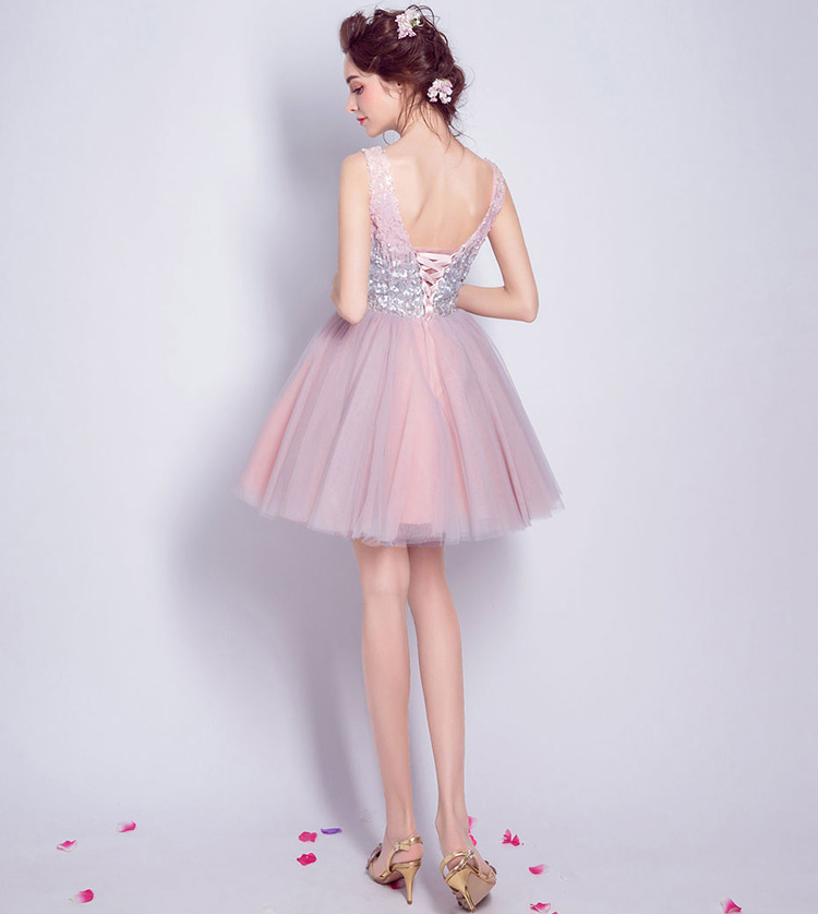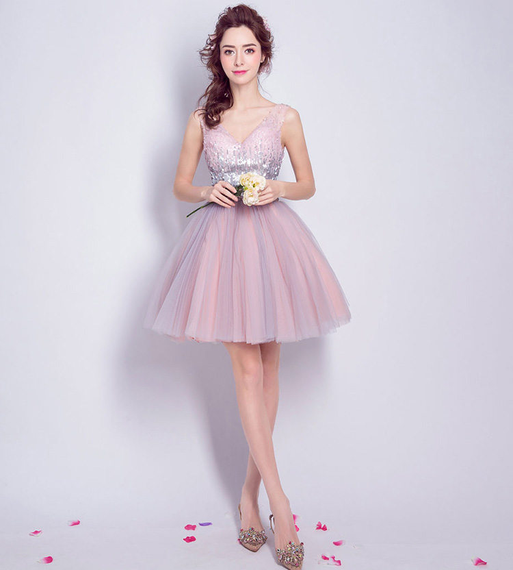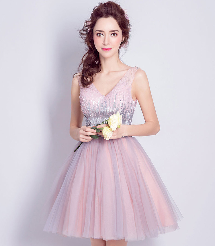 Pink Sequin Bling Sexy Short Deep V-Neck Evening Dress