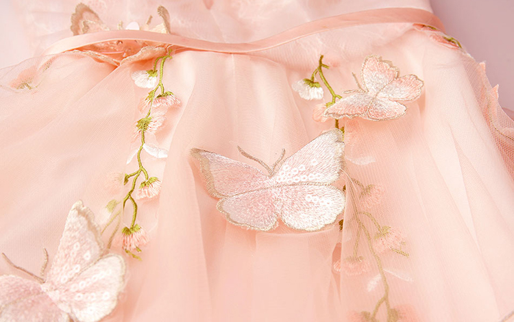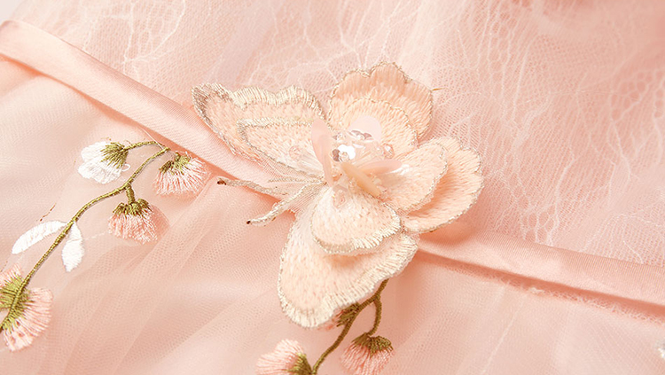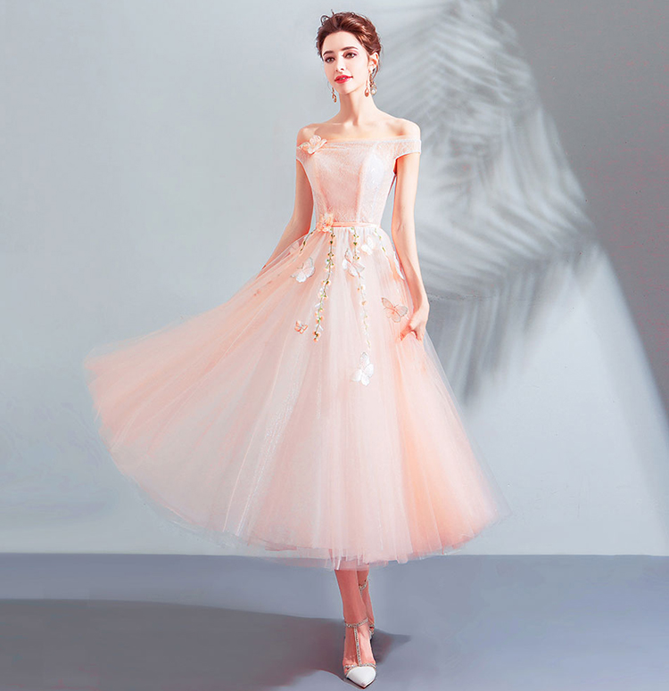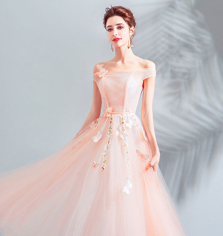 This dress features a lace illusion bodice and off the shoulder skirt; Alluring off the shoulder with butterfly; A-line silhouette.