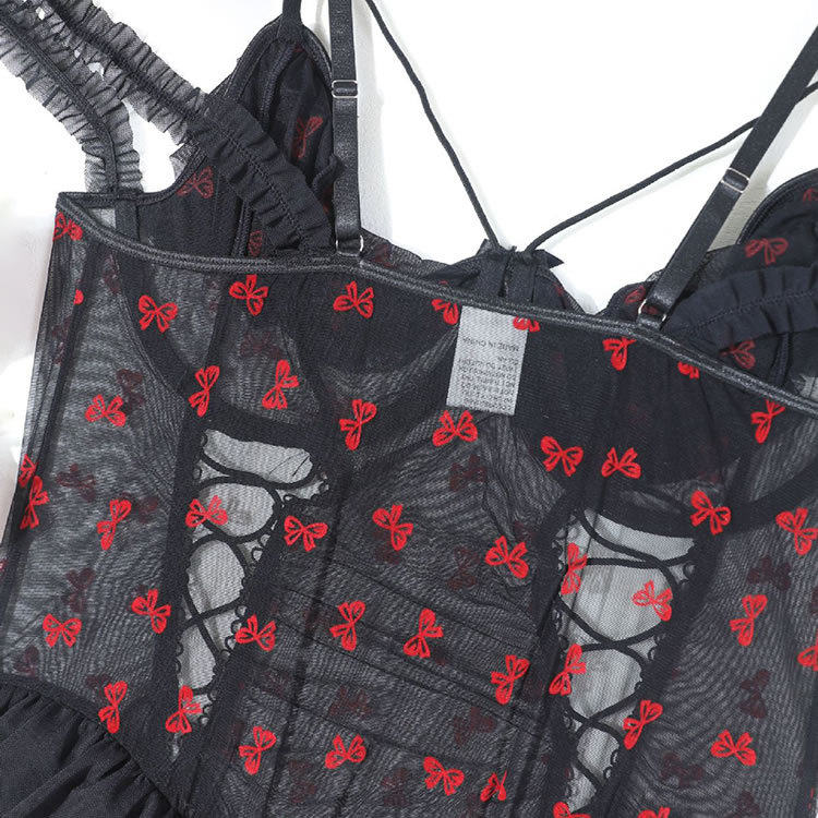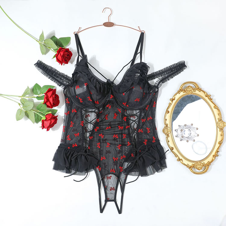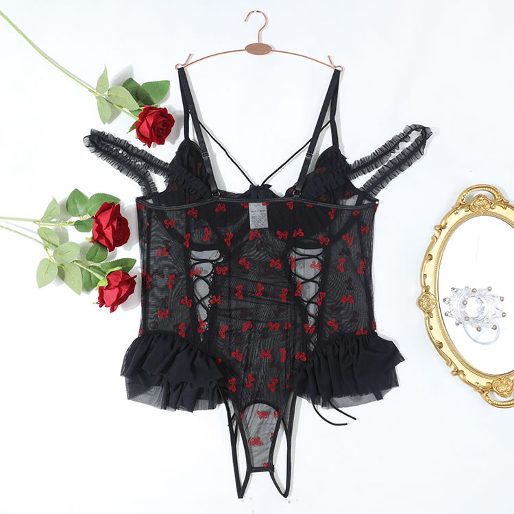 This captivating lingerie set combines elegance and allure with its black lace and sheer mesh design. The off-the-shoulder neckline and strappy accents create a seductive look, while the intricate lace detailing adds a touch of sophistication. The fitted design enhances your natural curves, and the adjustable straps ensure a comfortable fit. Perfect for adding a touch of glamour to any occasion.