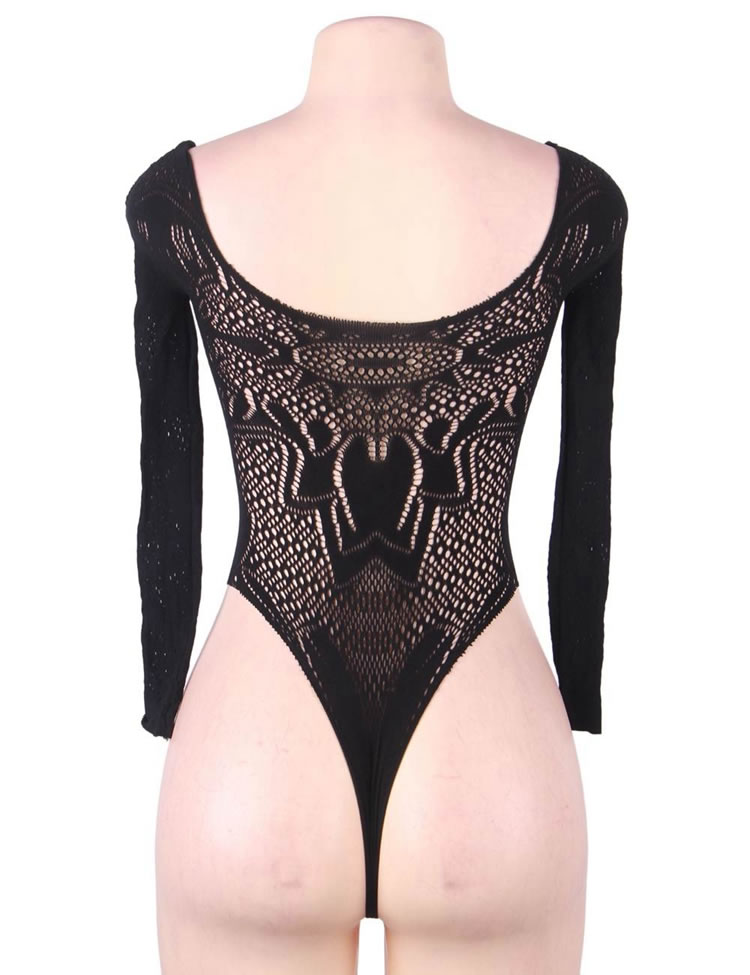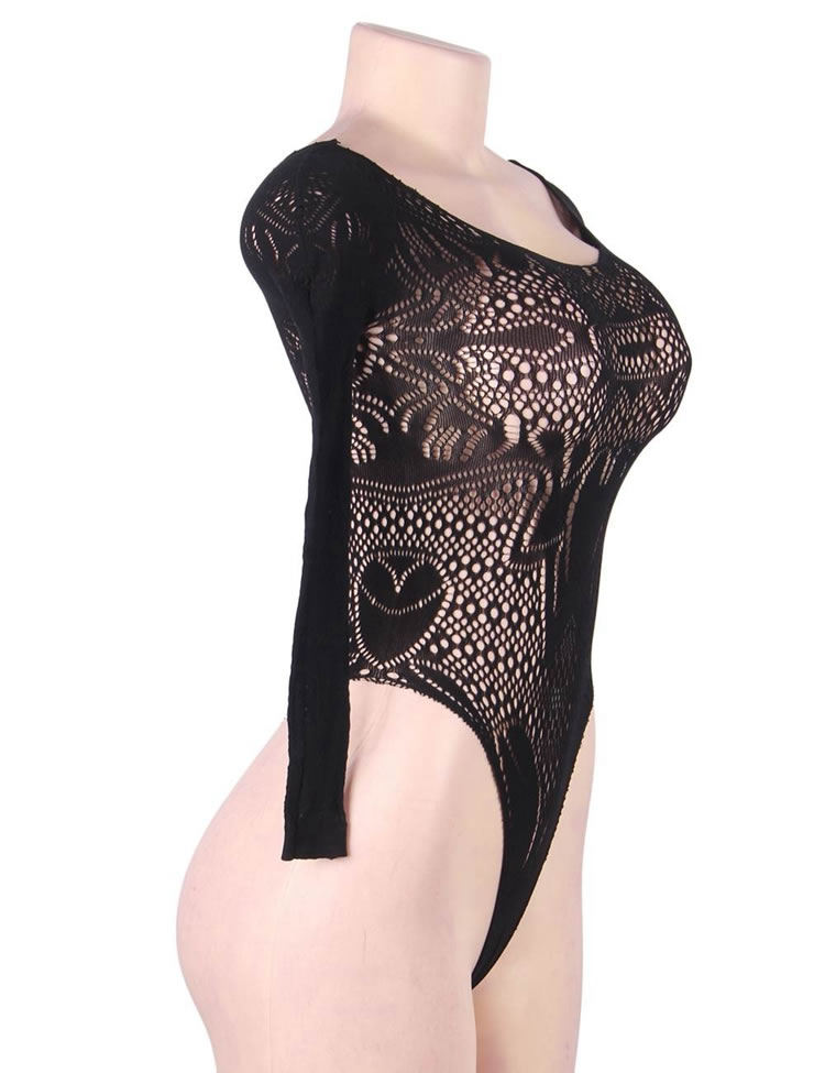 Stand out in the bedroom with this stunning plus size bodysuit featuring sheer lace cups, a scoop neckline, long fitted sleeves, a sheer bodice, and a cheeky cut back. (Panty not included.)
