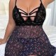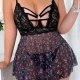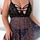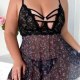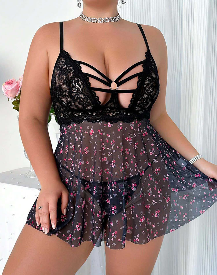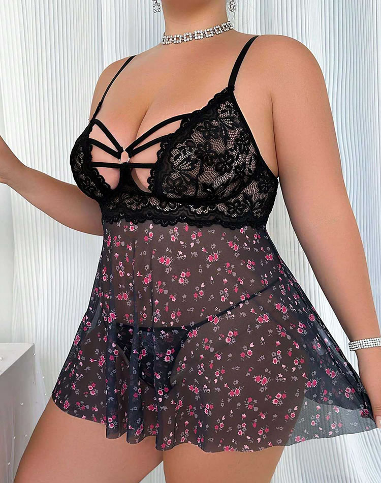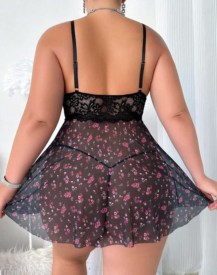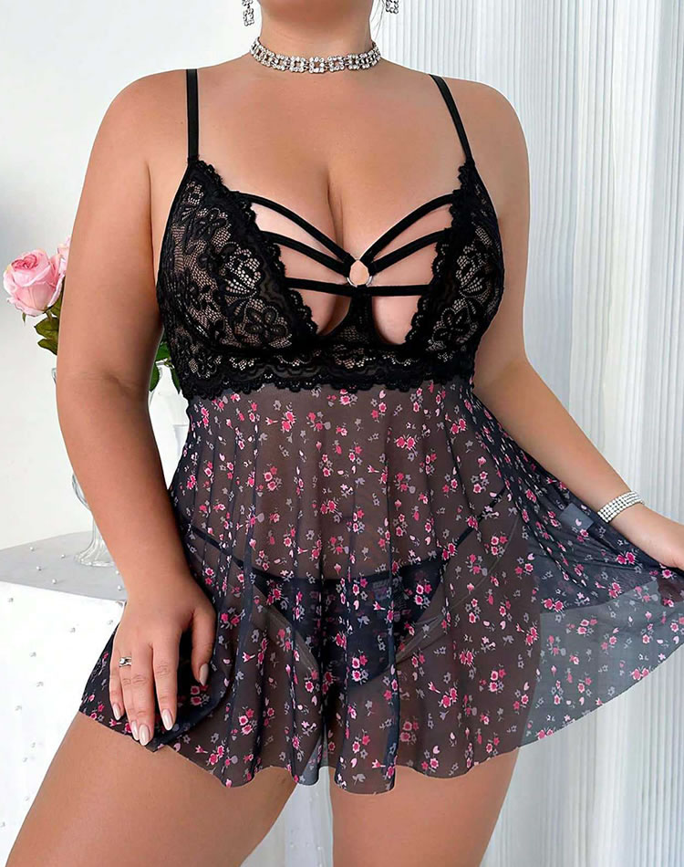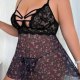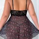 Plus Size Black Lace Babydoll with Floral Mesh Skirt