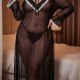 This plus-size sheer lingerie robe offers a bold and daring look with its elegant black mesh fabric and delicate white lace trim. Designed with long sleeves and a deep V-neckline tied with a bow at the center, it combines romance with confidence. The lace detailing along the collar and cuffs adds a vintage-inspired touch, while the mid-length cut ensures both coverage and allure. Perfect for intimate moments or as a statement piece, this robe celebrates curves with a blend of mystery and charm.