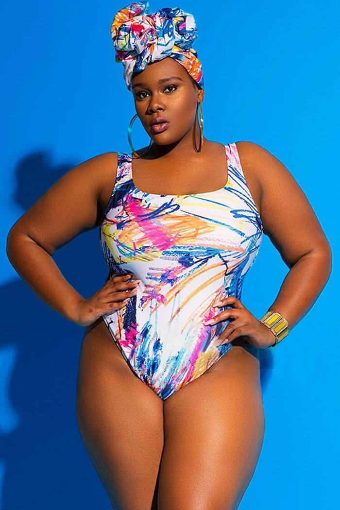 Live your best life with this one piece bathing suit. This plus size swimwear is made out of spandex and nylon in colorful scrawl pattern, a scoop neckline and wide shoulder straps, brief-cut bottom in moderated coverage.