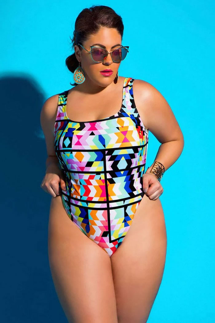 Endure your active lifestyle and fun in the sun in this one piece bathing suit. This plus size swimwear is made out of nylon and spandex in colorful geometrical printed, a scoop neckline and cups padding, shoulder straps, high cut leg bottom with cheeky coverage.