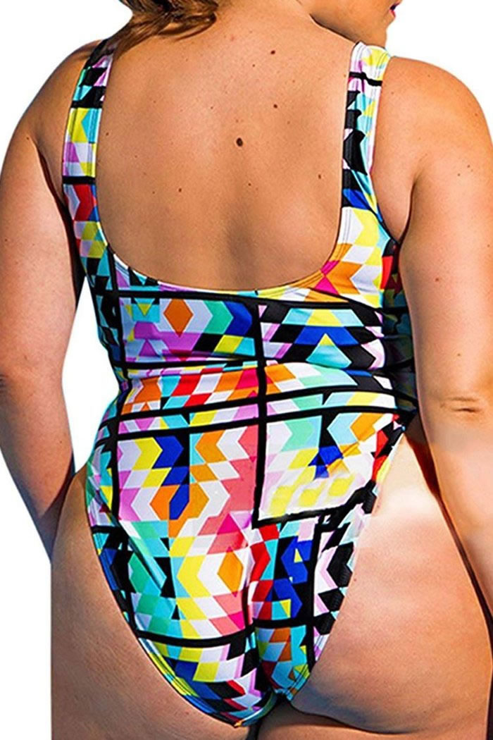 Plus Size Colorful Geometric Print High Cut One Piece Swimsuit