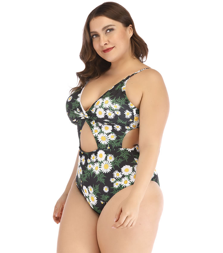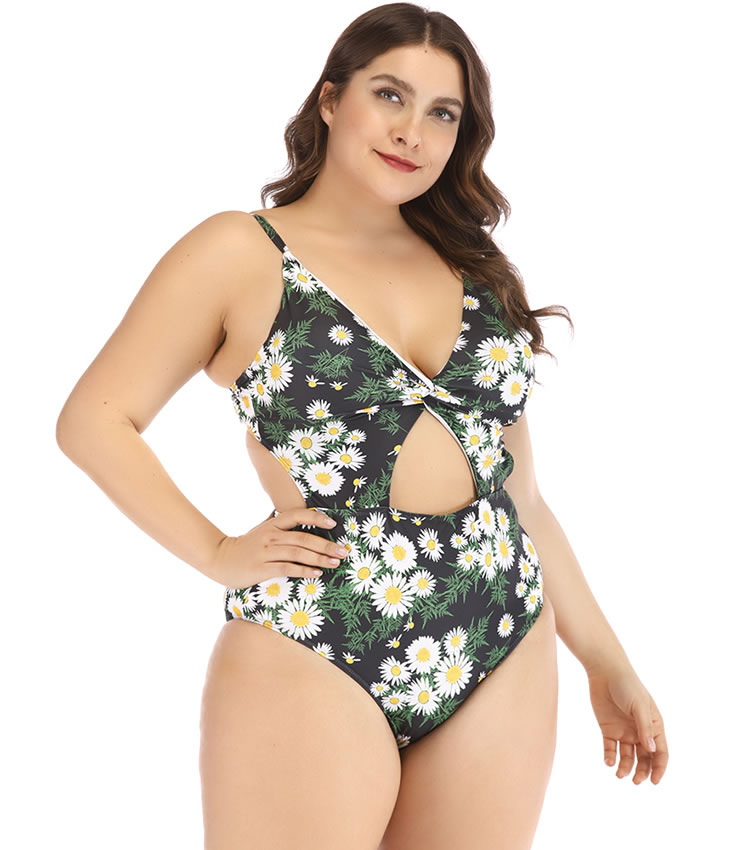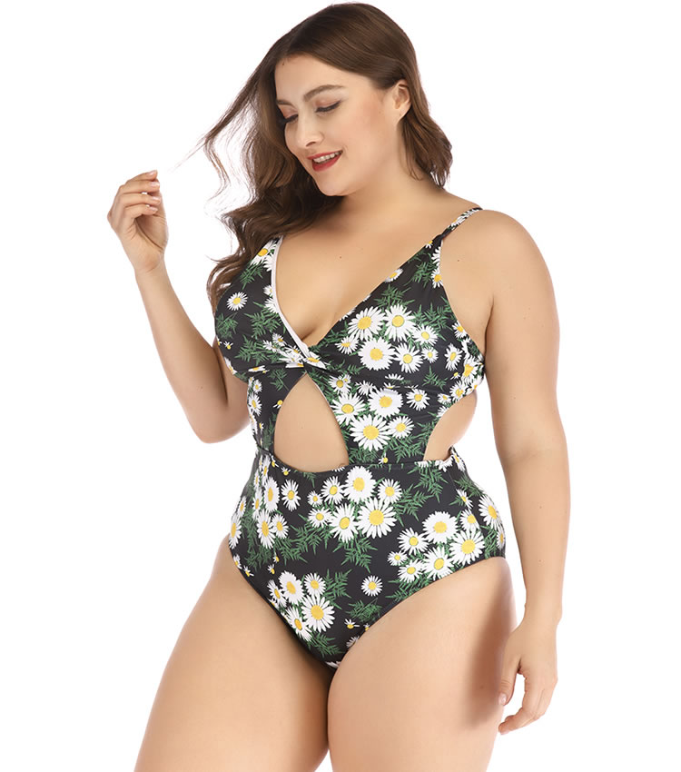 Lounge poolside in this plus size one piece swimsuit featuring a deep V-neckline, a keyhole front opening, adjustable spaghetti straps, a back hook closure, a back keyhole opening, and a cheeky cut back.