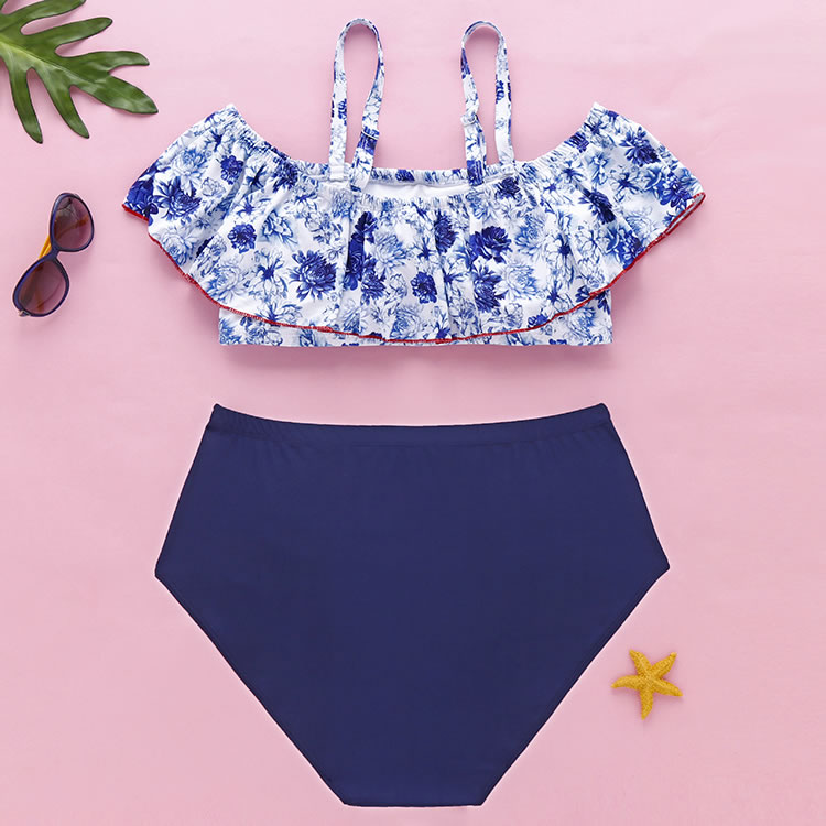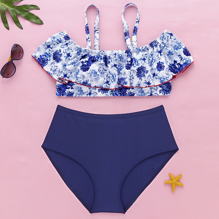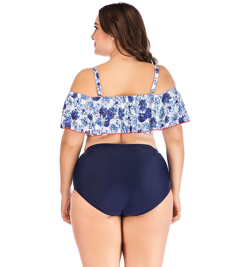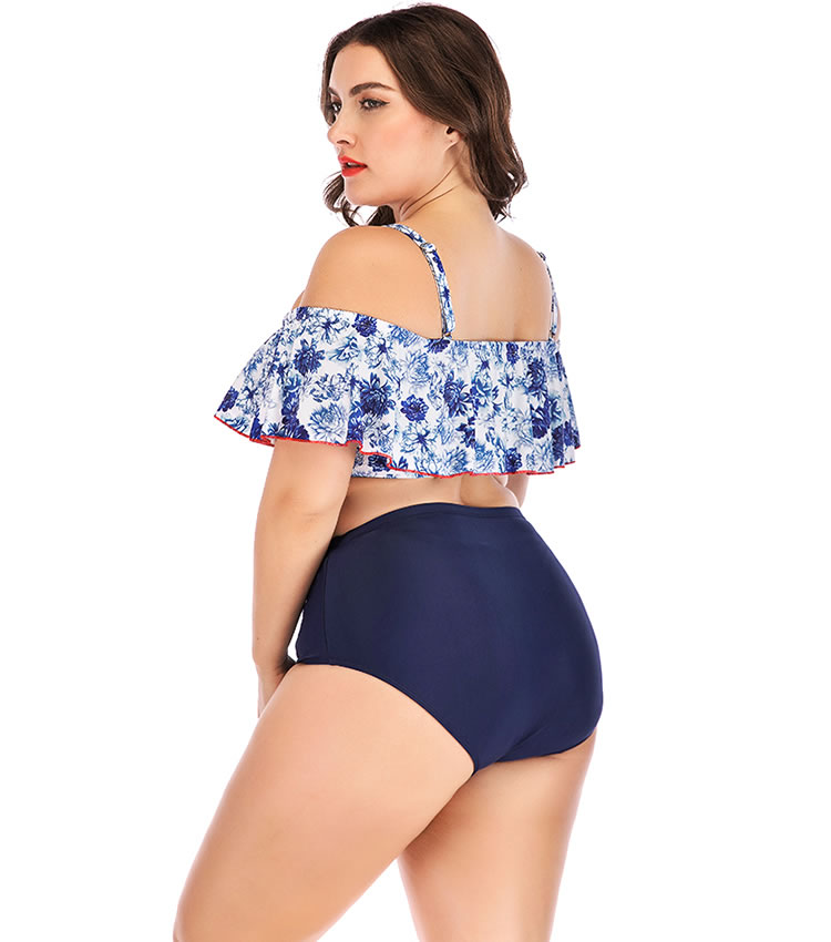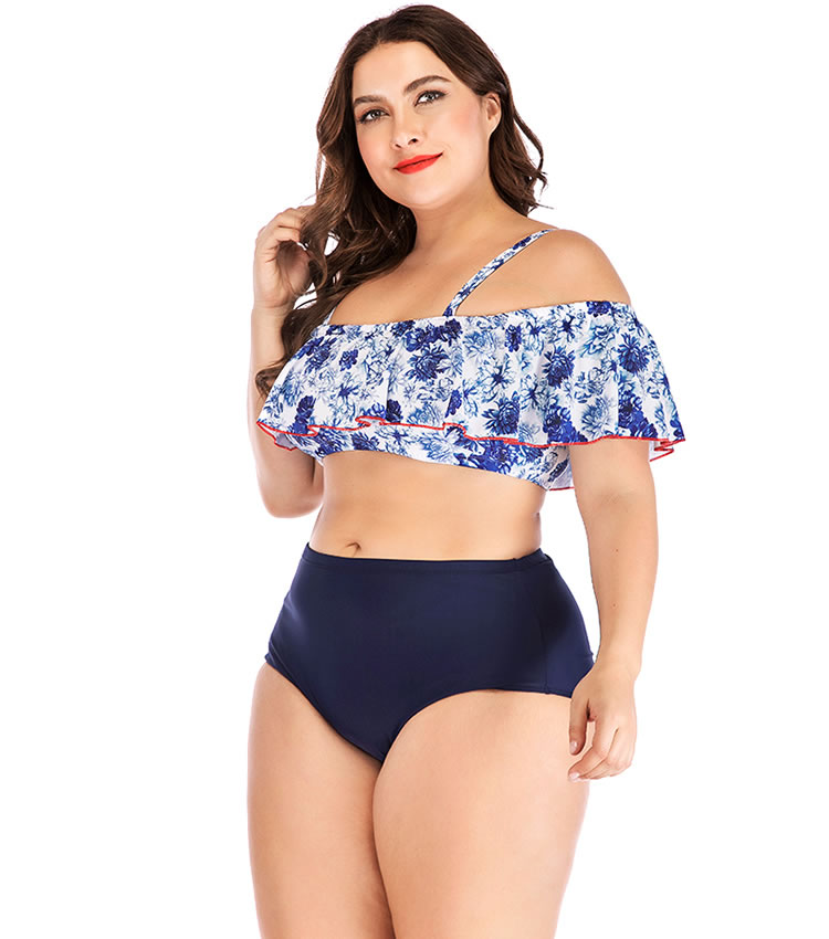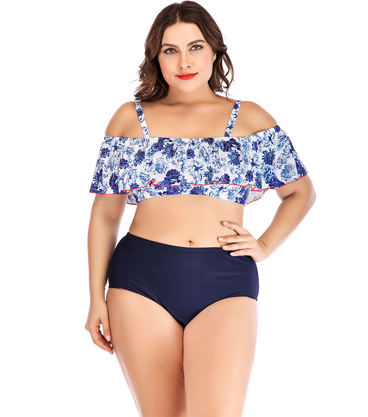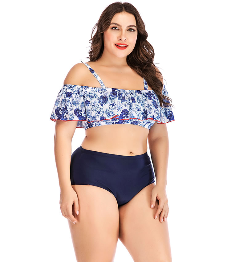 Bask in the sun in this exclusive plus size bikini top featuring a ruffled neckline with off-the-shoulder sleeves, adjustable spaghetti straps, a matching bottom with high waist and a full back.