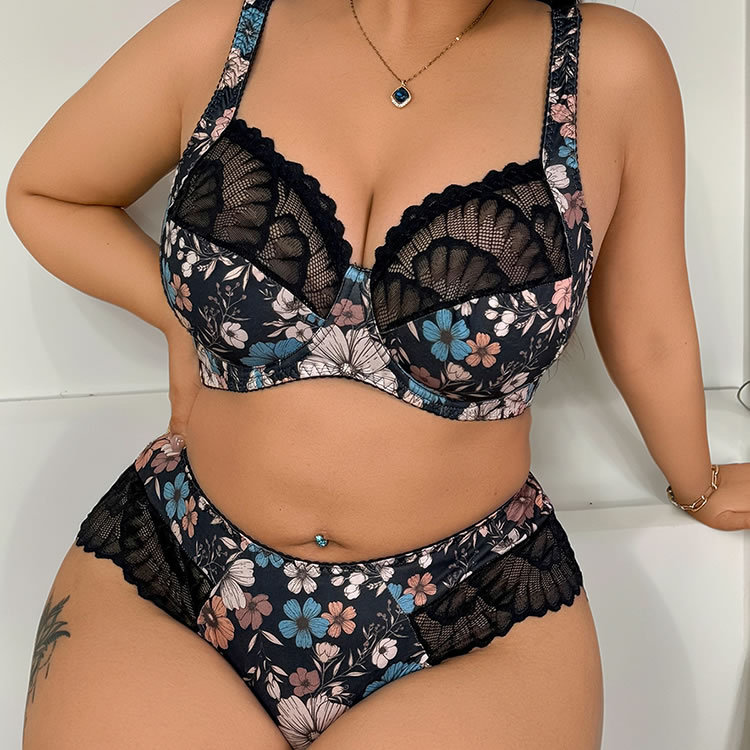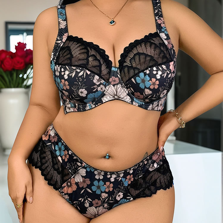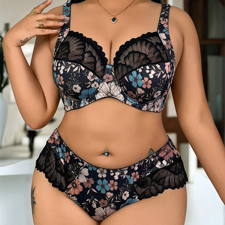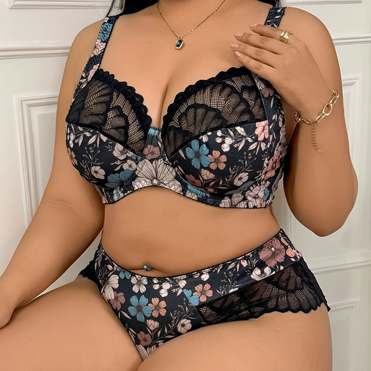 Plus Size Floral Print Lace Bra and Panty Set