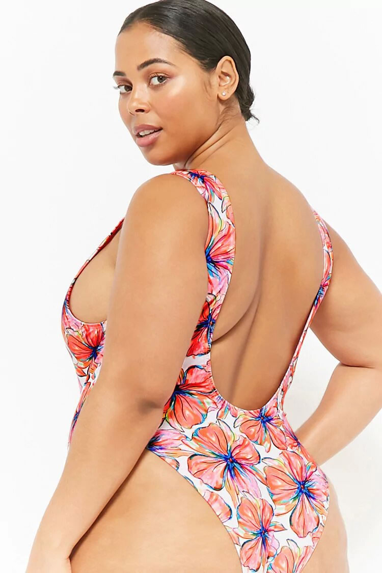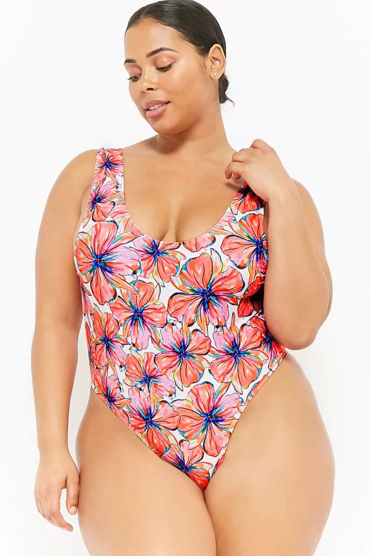 Stylish plus size bathing suit featuring a scoop neckline, and a low back, high cut leg design and cheeky fit, allover floral print.