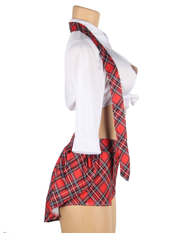 Need a makeover? As if! Get what you want out of life in this Get A Clue costume featuring a white crop top, long sleeves, a red plaid necktie, a matching high waisted, pleated shorts.