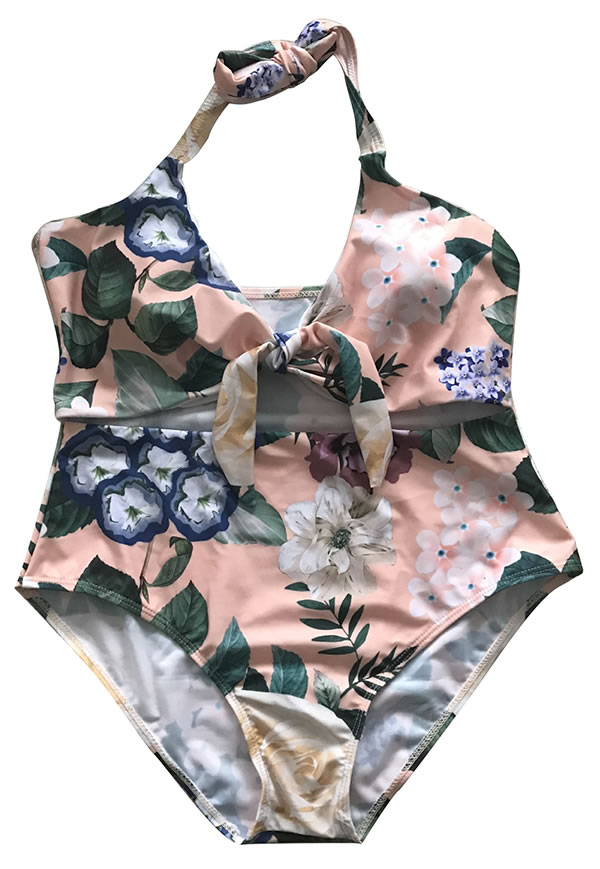 Refresh your swim look with this pretty pink color one piece bathing suit. This plus size swimwear is made out of spandex and nylon in floral pattern, a knotted tie on the front, tie halter straps on neck and soft paddings, cutout details under the bust, brief-cut bottom with moderated coverage back.