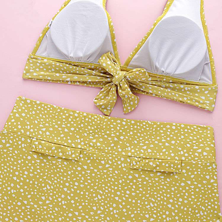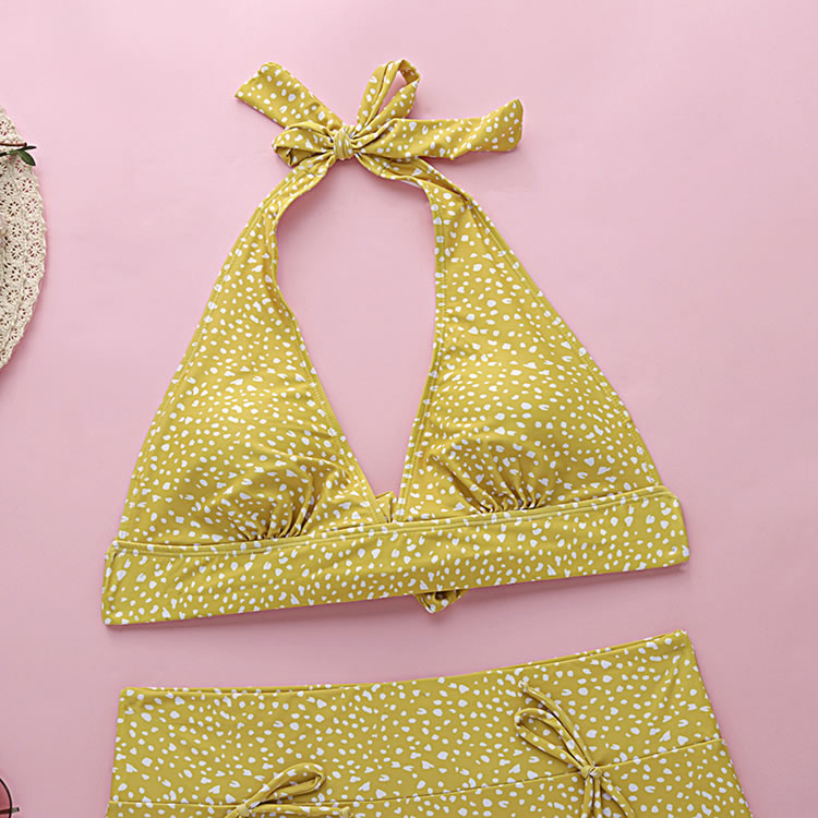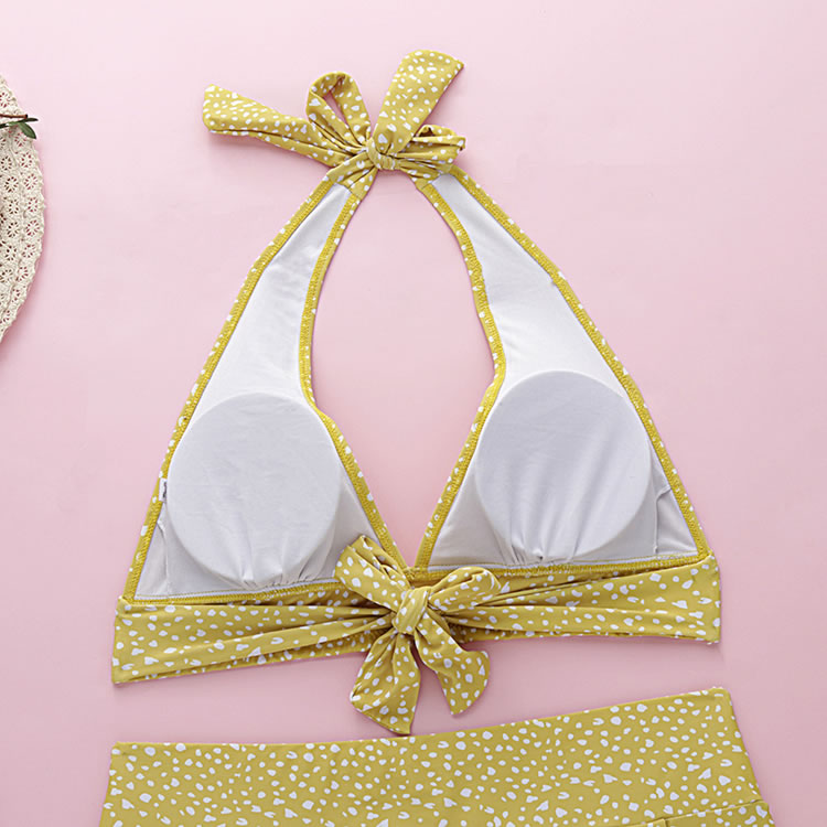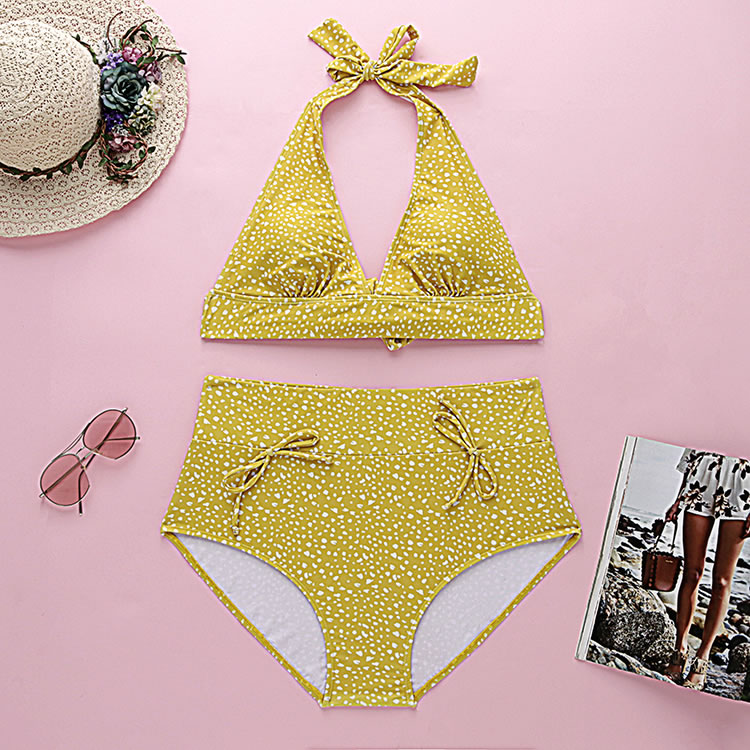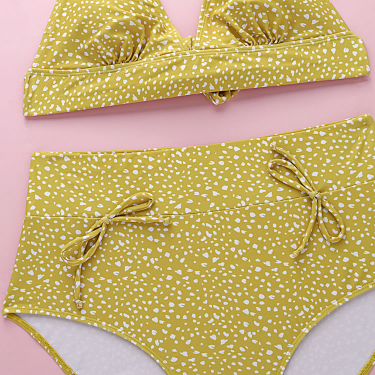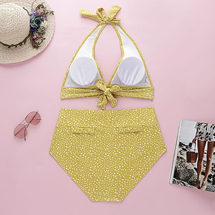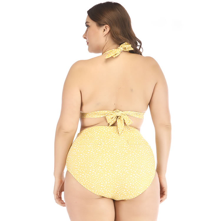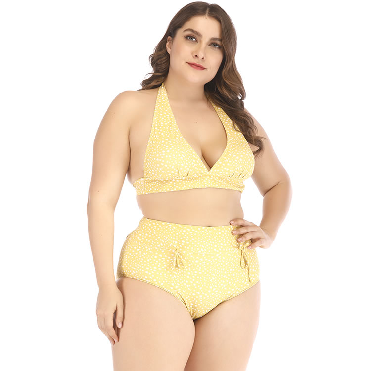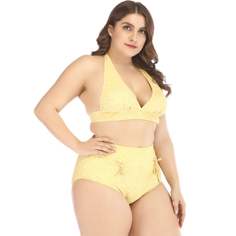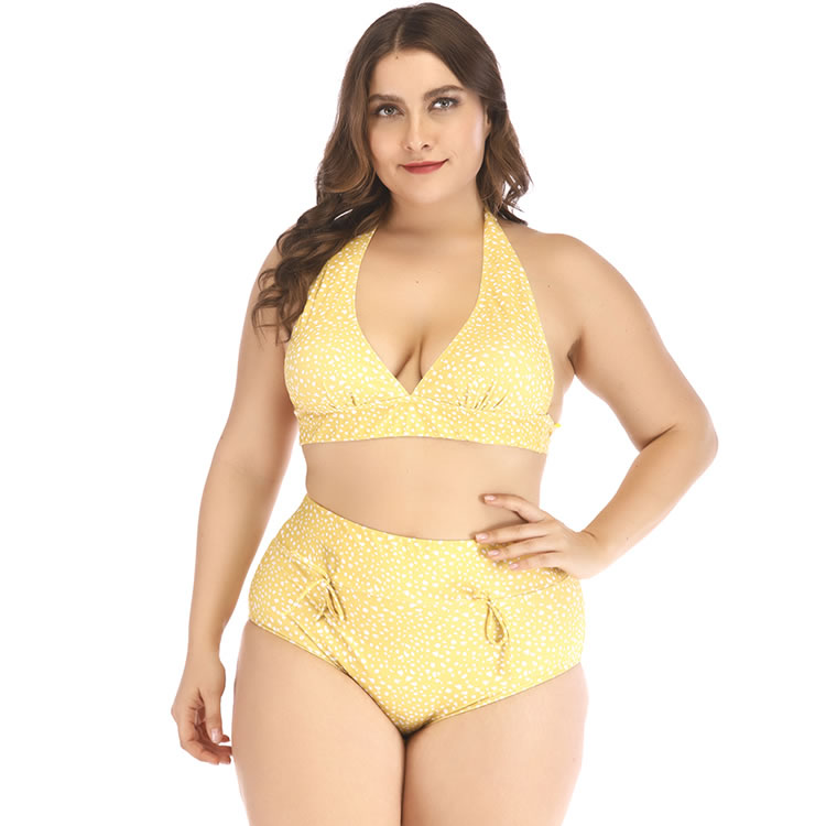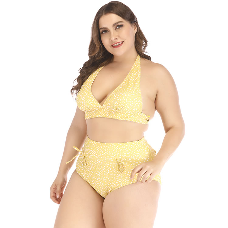 Make a splash in this cute plus size swimwear featuring an allover polka dot design, halter straps, a tie back closure, and a matching bottom with two bow side detail, a high waist and a cheeky cut back.
