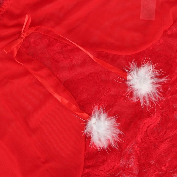 Get yourself to the top of Santa's list in this plus size exclusive Holiday Romance lingerie costume featuring sheer lace cups with a white fur trim, a satin bow accent, adjustable spaghetti straps, and a matching g-string.