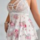This plus-size lingerie set combines soft elegance with bold design. The top features a delicate white lace bustier with intricate crisscross straps and a central ring detail that adds a modern touch. The flared skirt is made of lightweight fabric adorned with a vibrant floral print in shades of pink, red, and lavender, creating a romantic silhouette. Designed for comfort and confidence, it offers adjustable shoulder straps and a flattering fit that celebrates full figures.