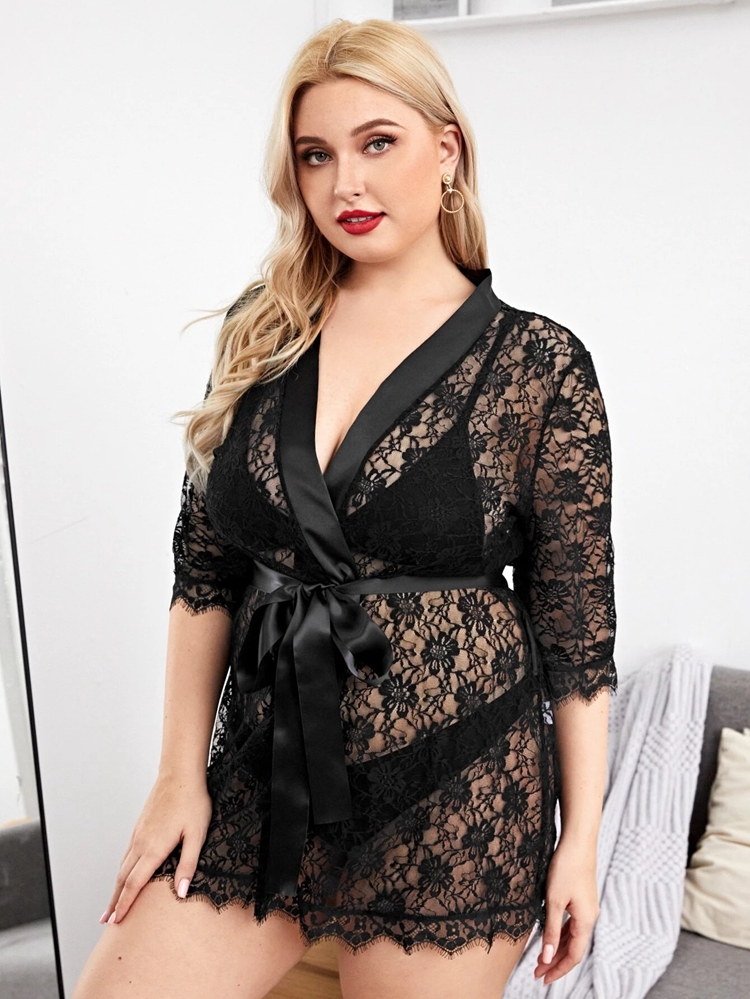 Wrap your curves in this breathtaking plus size robe set featuring a sheer eyelash lace trimmed robe, short sleeves, a waist tie, and a matching panty with a g-string cut back.