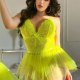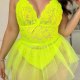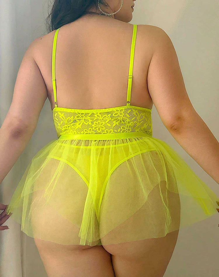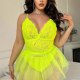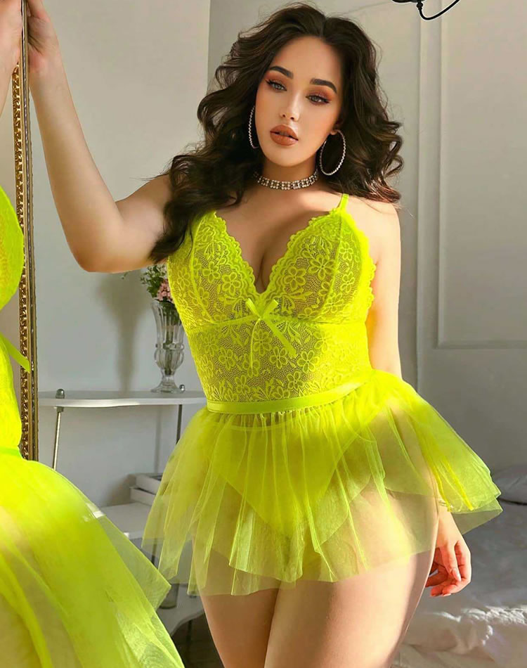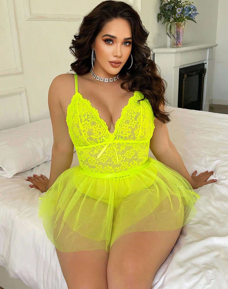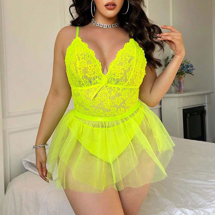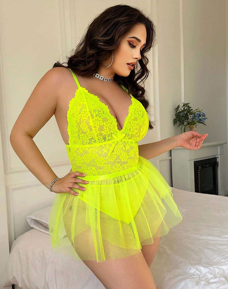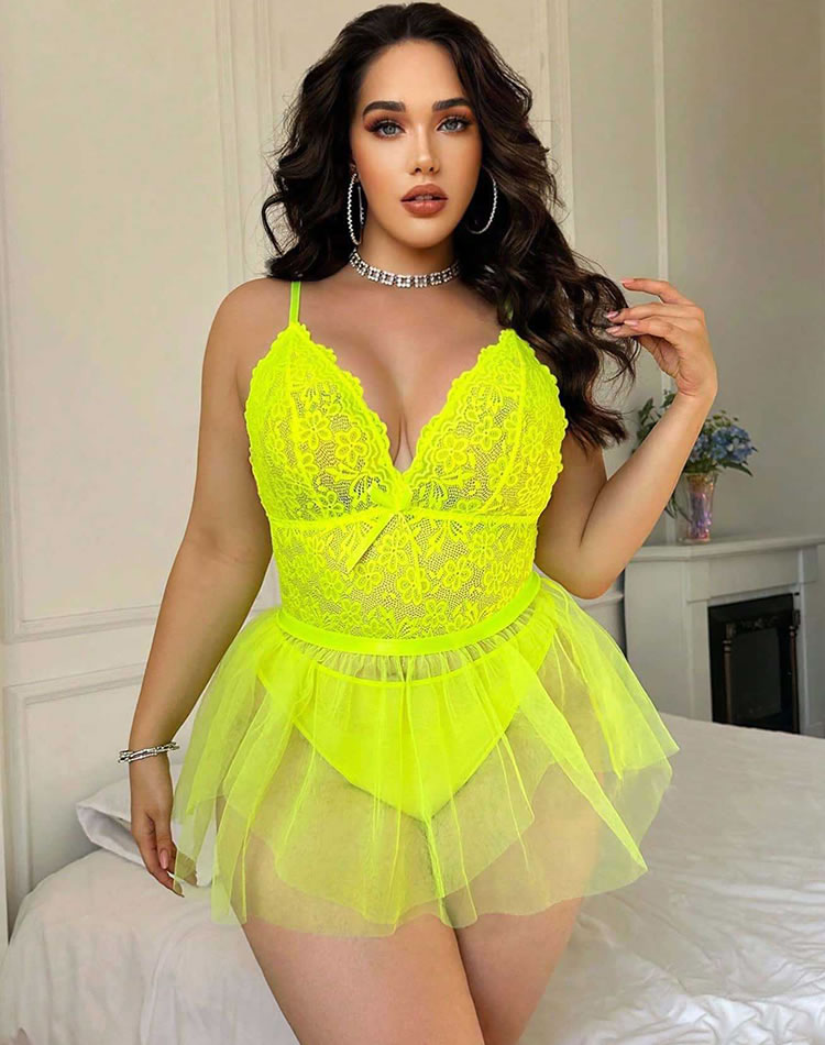 This bold plus-size lingerie set makes a vibrant statement with its eye-catching neon yellow design. The top features a detailed lace bustier with a deep V-neckline and a small bow at the center, offering both support and style. The attached tulle skirt adds volume and movement, creating a playful, flirty silhouette. With thin adjustable straps and an open back, it’s designed for comfort and confidence—perfect for those who love to stand out.