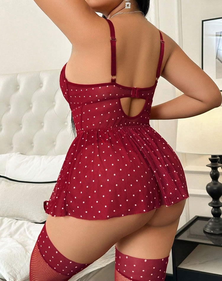 Designed with confidence in mind, this plus-size red polka dot lingerie set brings bold style and flattering fit. The structured bustier features lace trim and a crisscross front detail that adds dimension and support, while the flared mesh skirt enhances curves with playful movement. Adjustable straps and an open back design ensure comfort and a personalized fit, making it ideal for those who love to feel both empowered and alluring.